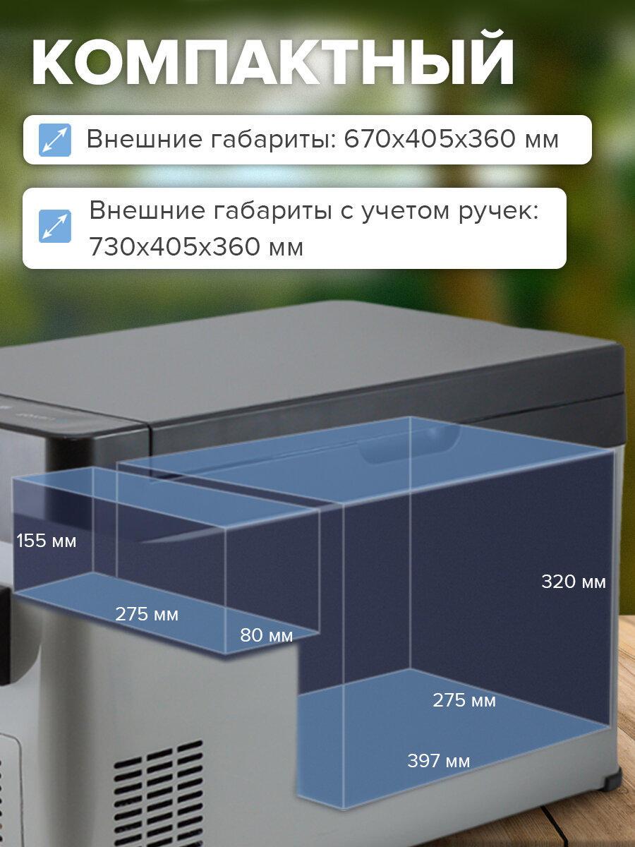 - Если на улице до +30гр., то за ночь при отключенном холодильнике продукты не испортятся - проверено. - 38 литров - объём хороший в путешествие для семьи с детьми. - Отлично поместился в Volkswagen Caravella между 1 и 2 рядом сидений. Учитывая насколько он большой - В нем можно как охлаждать, так и замораживать ? |