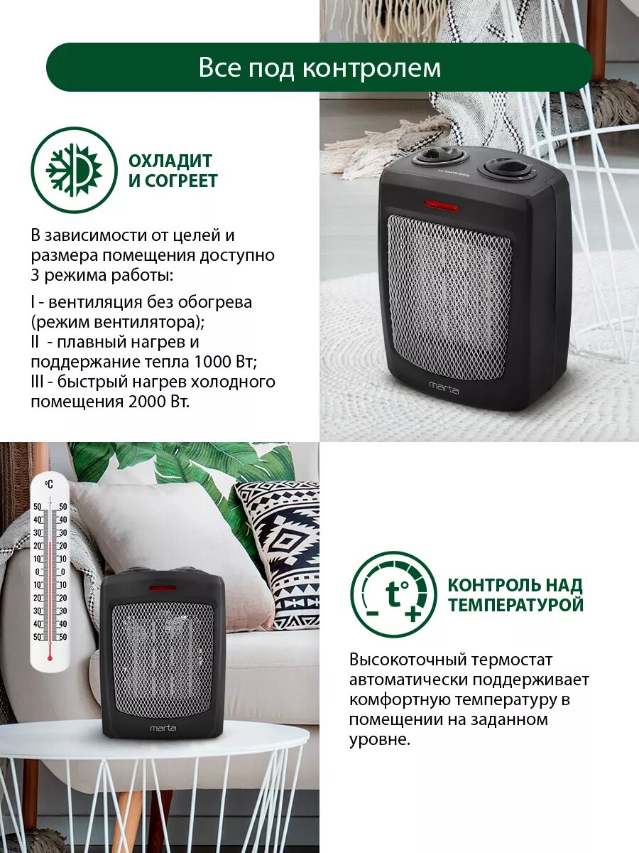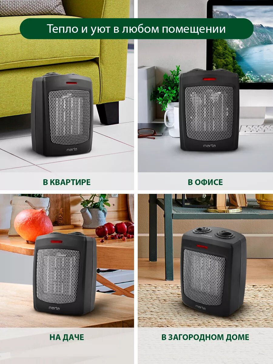 Приобретал этот тепловентилятор MARTA себе для гаража. Хороший агрегат, частенько выручал меня в холодное время года, когда вдруг что то надо отремонтировать. Конечно в лютый мороз гараж не обогреет, но значительно повысит температуру в помещении для комфортной работы. Работает хорошо, управление удобное. Защитная решетка не позволит обжечься. Использовал всю осень, зиму и весну, нареканий нет. Со своей задачей справляется.