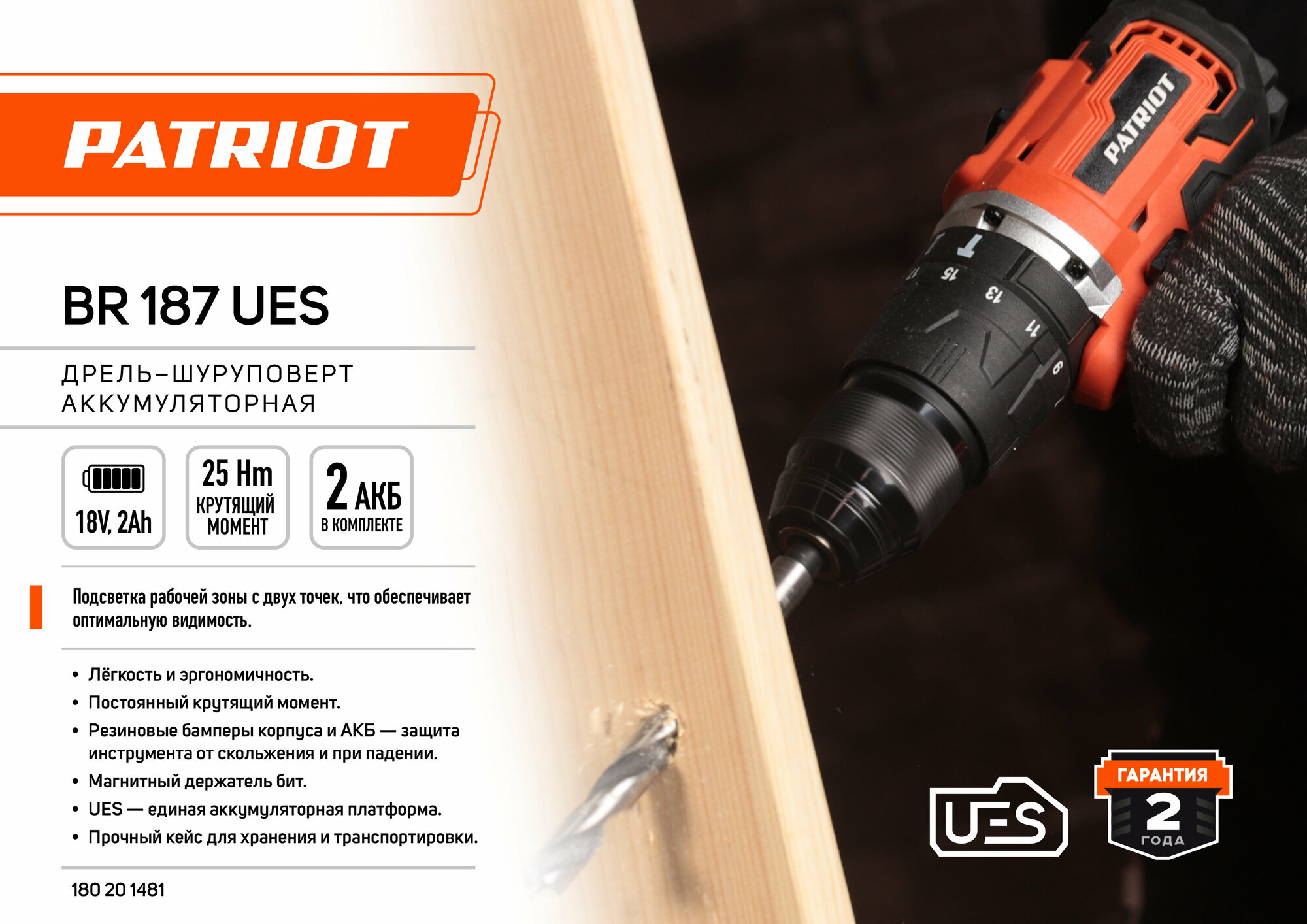 Дрель-шуруповерт Patriot BR 187UES, 18 В Li-Ion 2x2 Ач интересное: