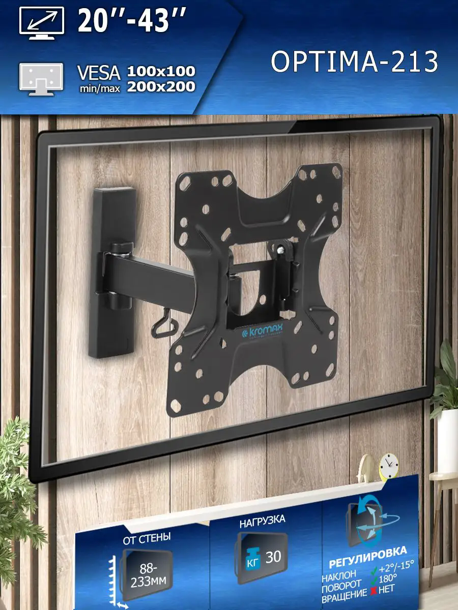 Кронштейн настенный Kromax OPTIMA-213 20-43" (наклон +5°/-12°, поворот 180°, до 30 кг, черный)