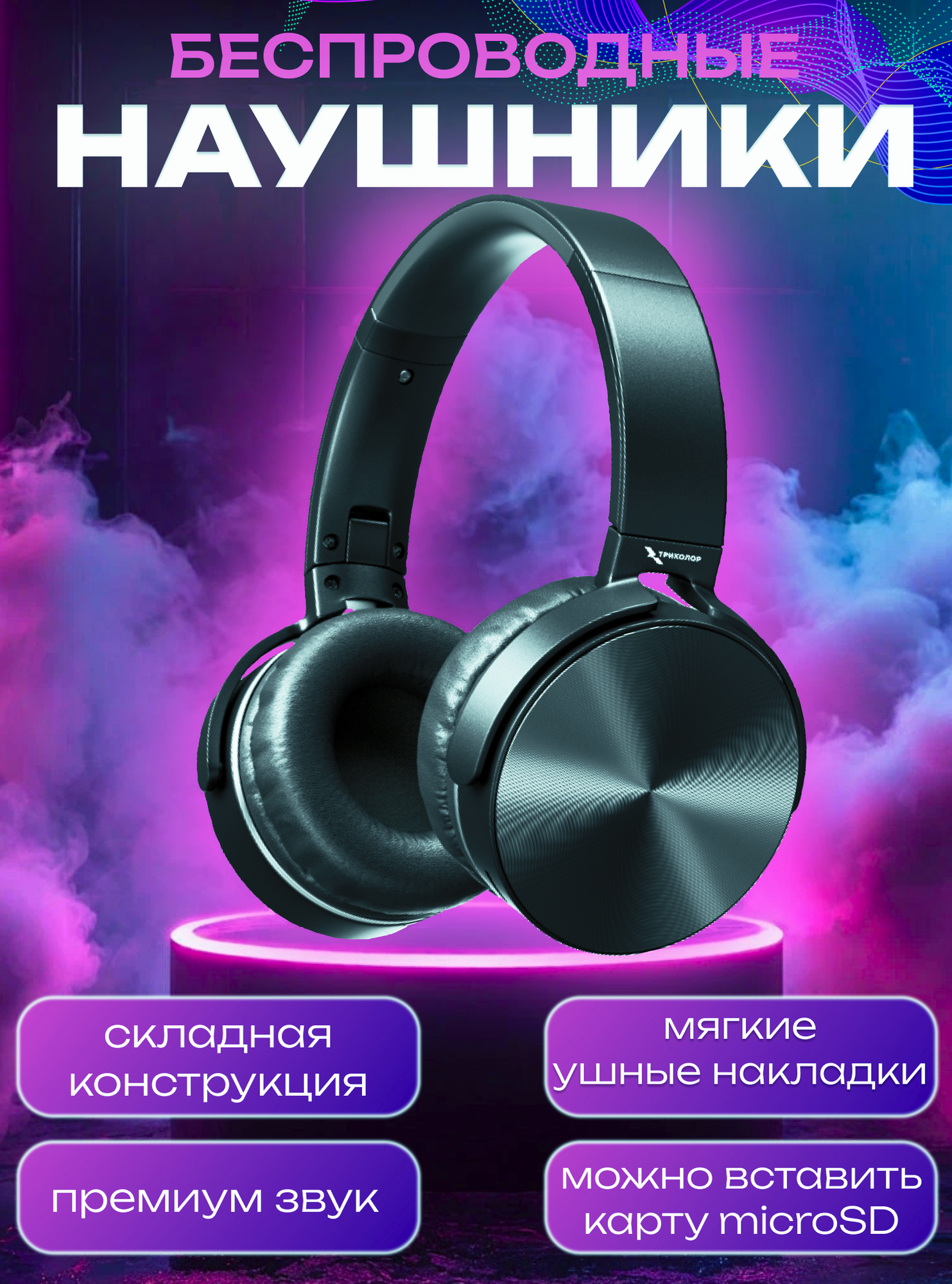 Наушники беспроводные полноразмерные Триколор, HB-001 интересное: