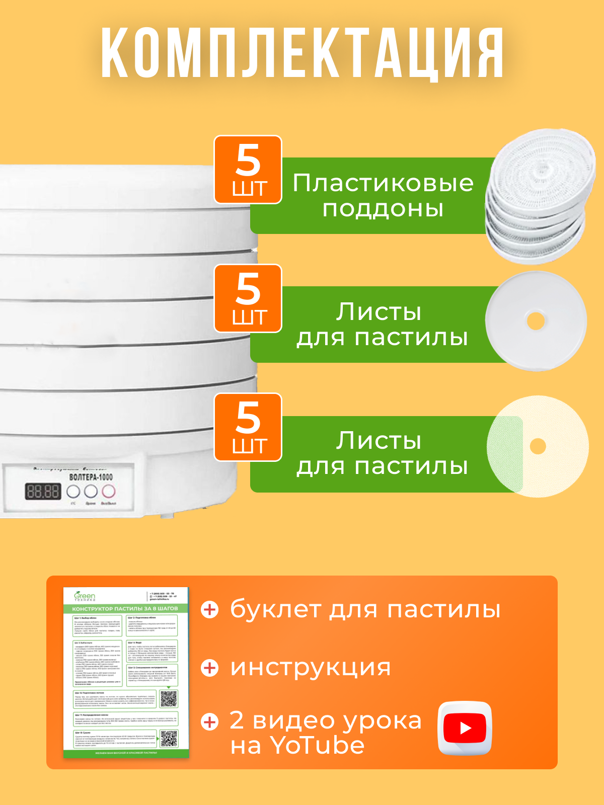 Комплект с сушилкой волтера 1000 люкс с таймером, 5 поддонами, 5 листами для пастилы, 5 сетчатыми листами интересное: