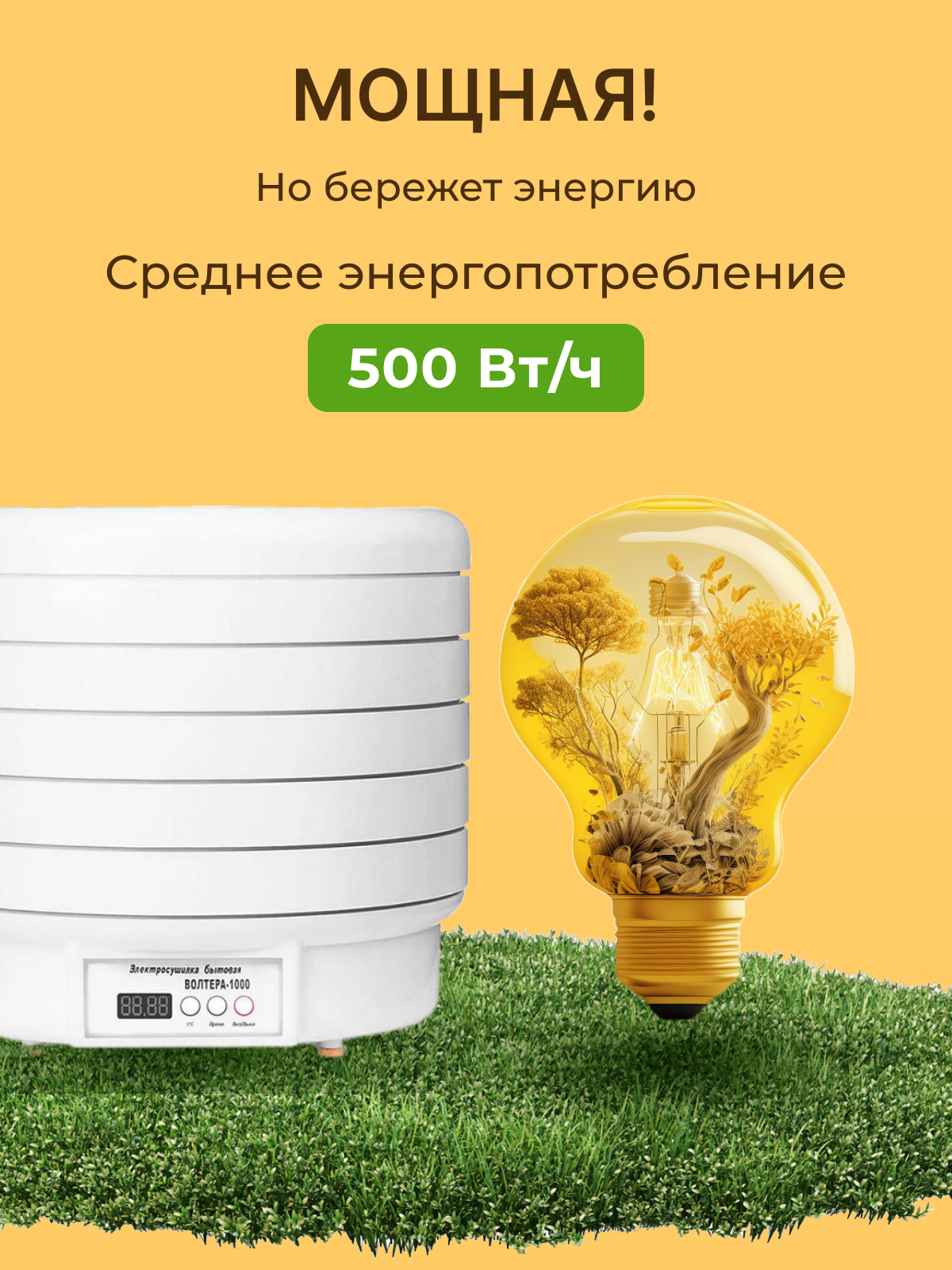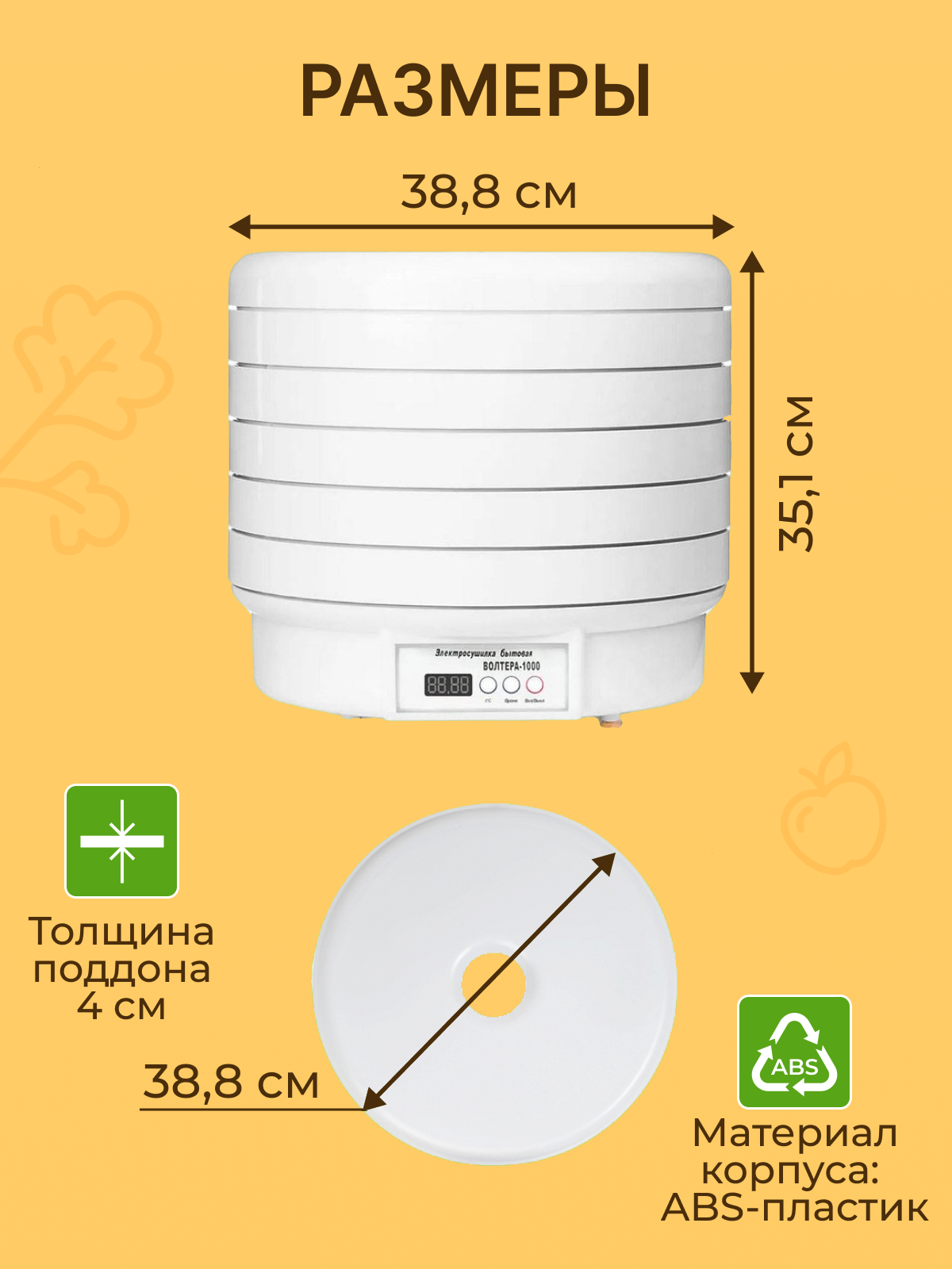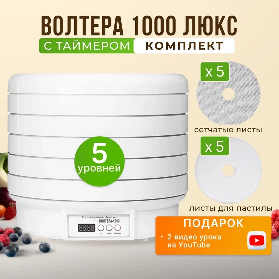 Сушилка ВолТера 1000 Люкс с таймером (с 5 решетчатыми, 5 сетчатыми и 5 поддонами для пастилы), белый