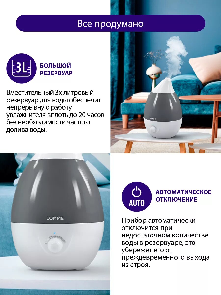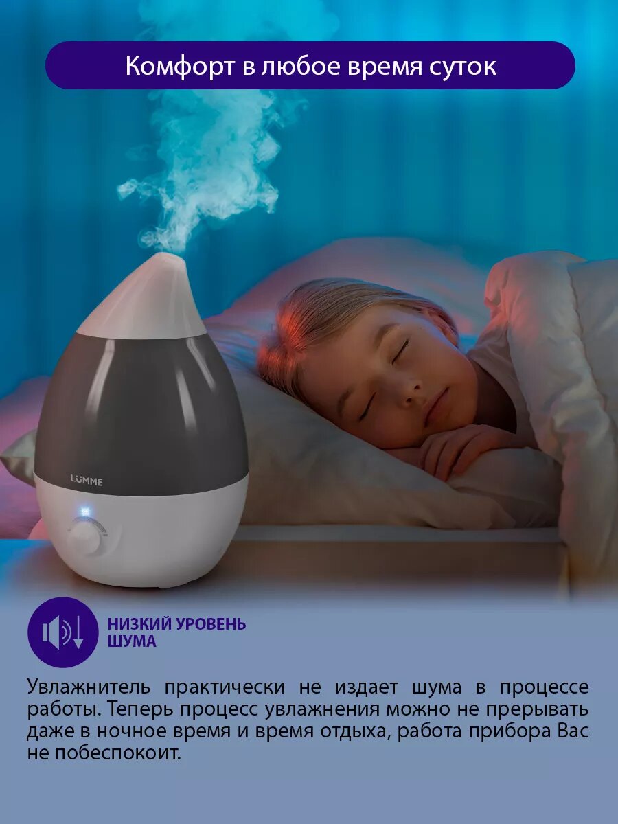 | Отзыв: | Увлажнитель специально брала с большим резервуаром, чтобы хватало подольше, но в реальности он смотрится очень миниатюрно, наверное за счет комбинации цветов. Выбрала именно LUMME поскольку в доме уже есть техника этой марки и служит она на совесть, а стоимость не зашкаливает как у других. Рассчитан на 30 квадратов, у нас комната чуть больше и нормально справляется |