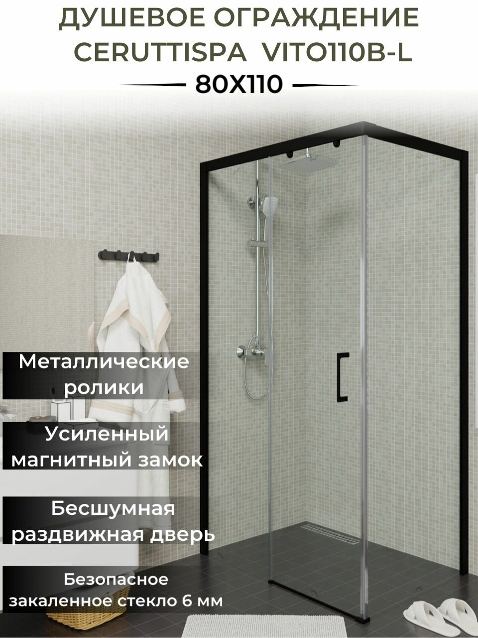 Душевой уголок Ceruttispa Vito110B-R (80x110x195), без поддона, профиль черный, стекло прозрачное