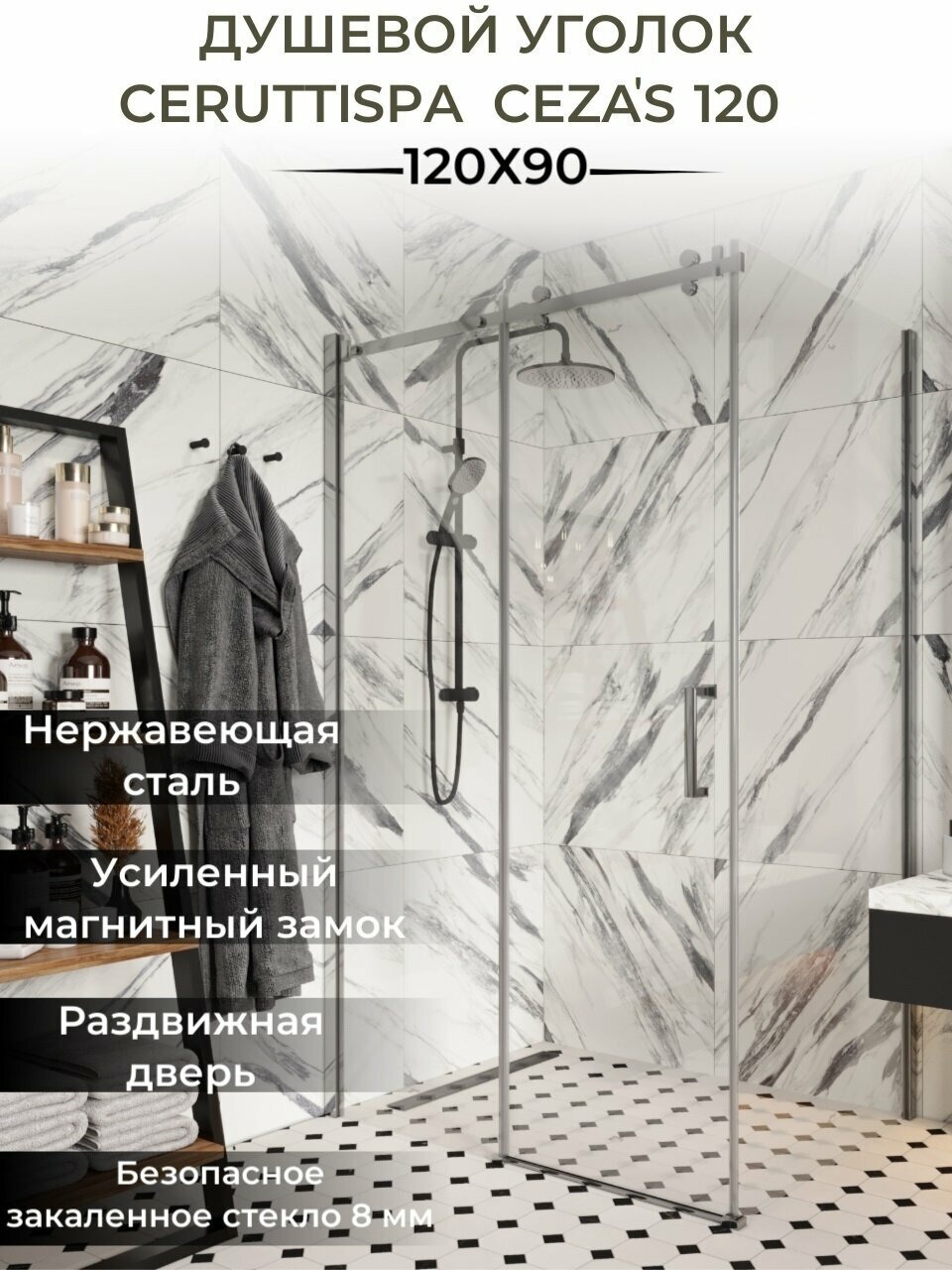 Душевой уголок Ceruttispa CEZA'S 120 (90x120x195), без поддона, профиль хром, стекло прозрачное