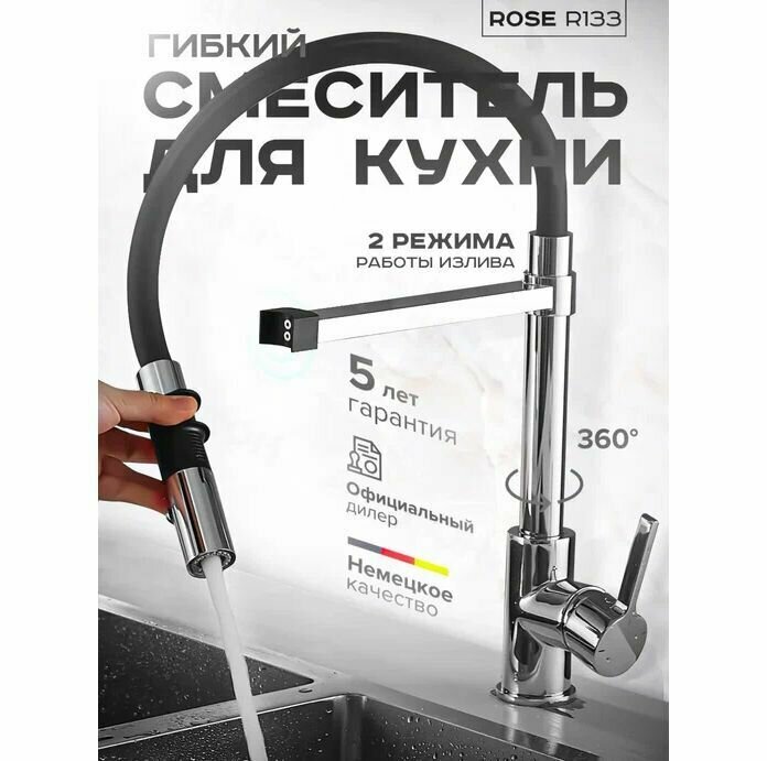 Смеситель для кухни с гибким изливом ROSE R133, латунь, цвет хром