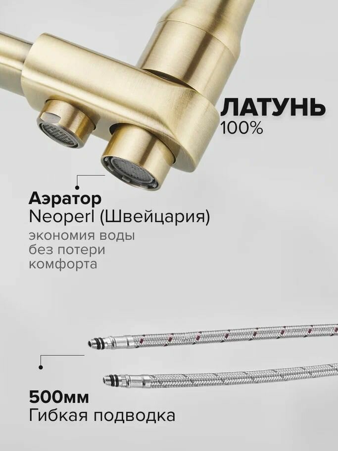 Смесители для кухни с гибким изливом и подключением фильтра ROSE R558L (латунь, цвет сатин)