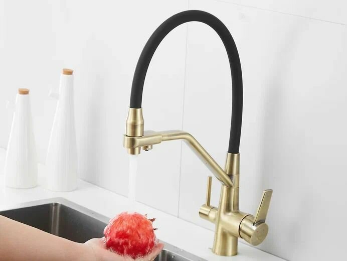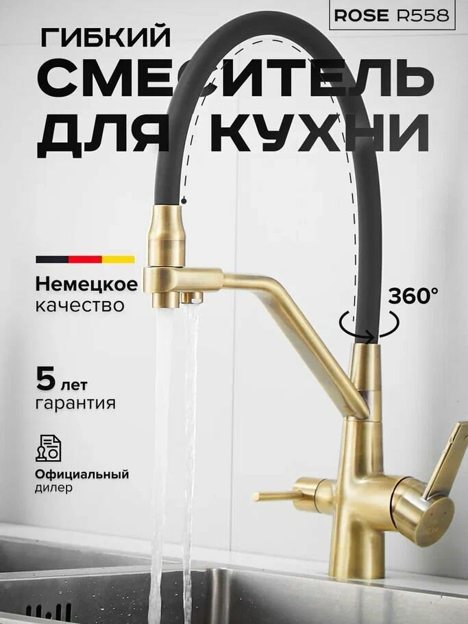 Смеситель для кухни с гибким изливом и подключением фильтра для воды Rose R558E, золото