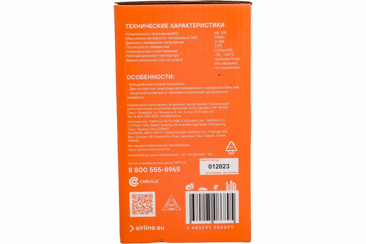 | Дополнительная информация | номинальное напряжение АКБ: 12В, максимальная ёмкость тестируемой АКБ 190Ач, время измерения под нагрузкой не более 5 сек |