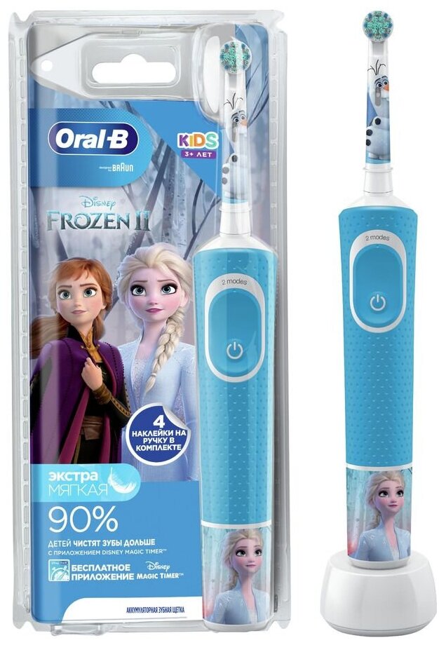 | Комплектация | 1 зубная щетка, 1 сменная насадка, 1 зарядное устройство, 1 дорожный чехол, 4 стикера с героями мультфильма «Холодное Сердце» |
