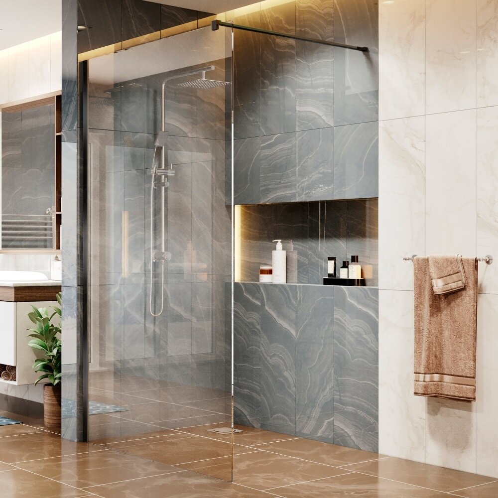 Душевая перегородка 90 см со свободным входом Ambassador Walk-in 15031109: душевая ширма из стекла 8 мм, профиль черный