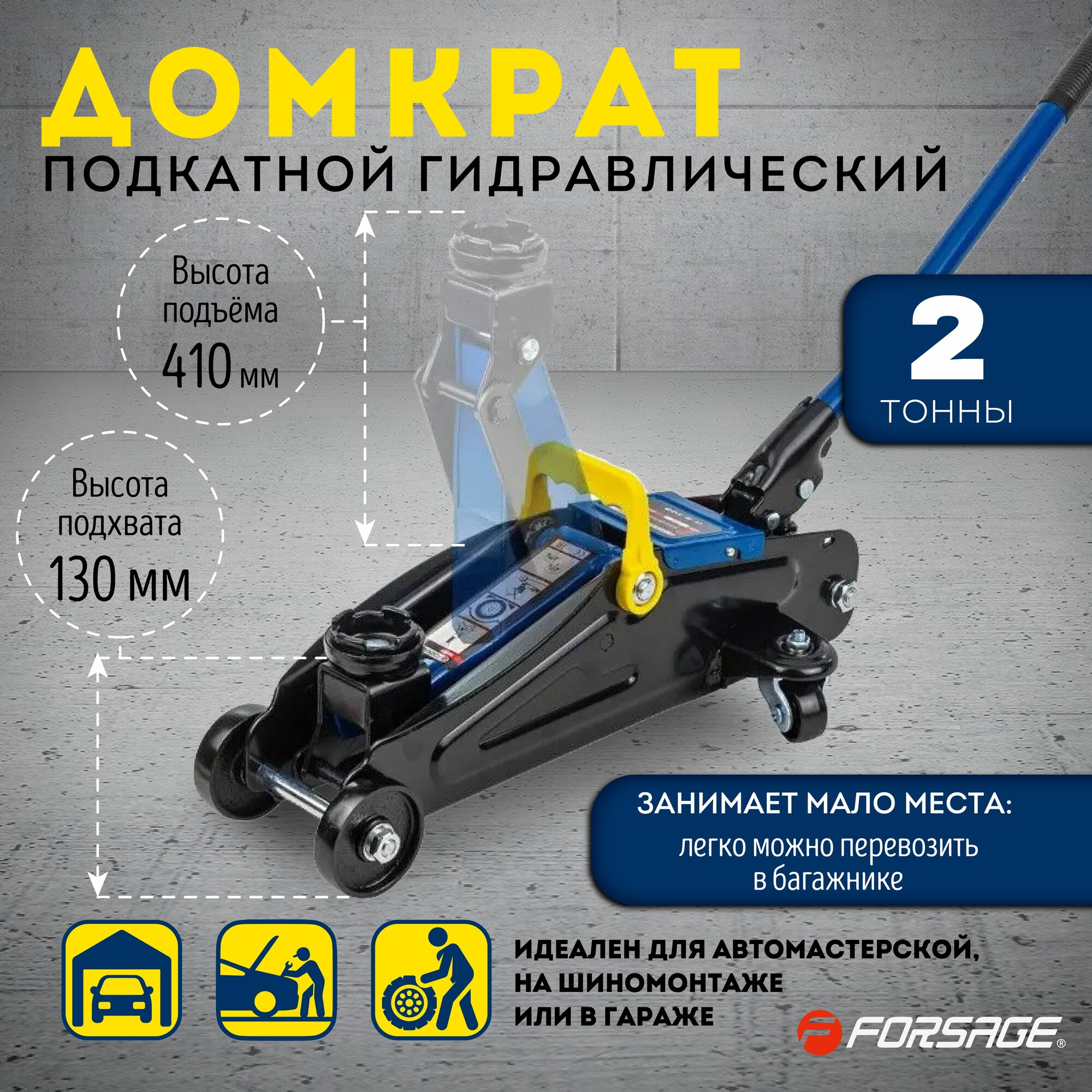 Купить Домкрат Подкатной 2 Т, Высота Подхвата 130 Мм, Высота Подъема 340 Мм FORSAGE арт. FTA820012