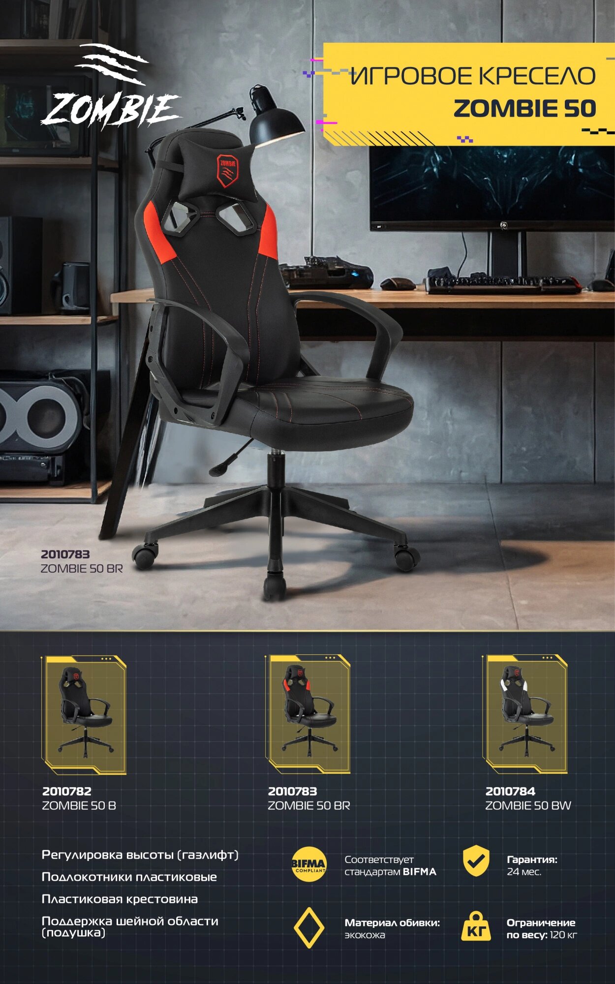 Кресло игровое ZOMBIE 50, на колесиках, эко.кожа, черный/белый [zombie 50 bw]
