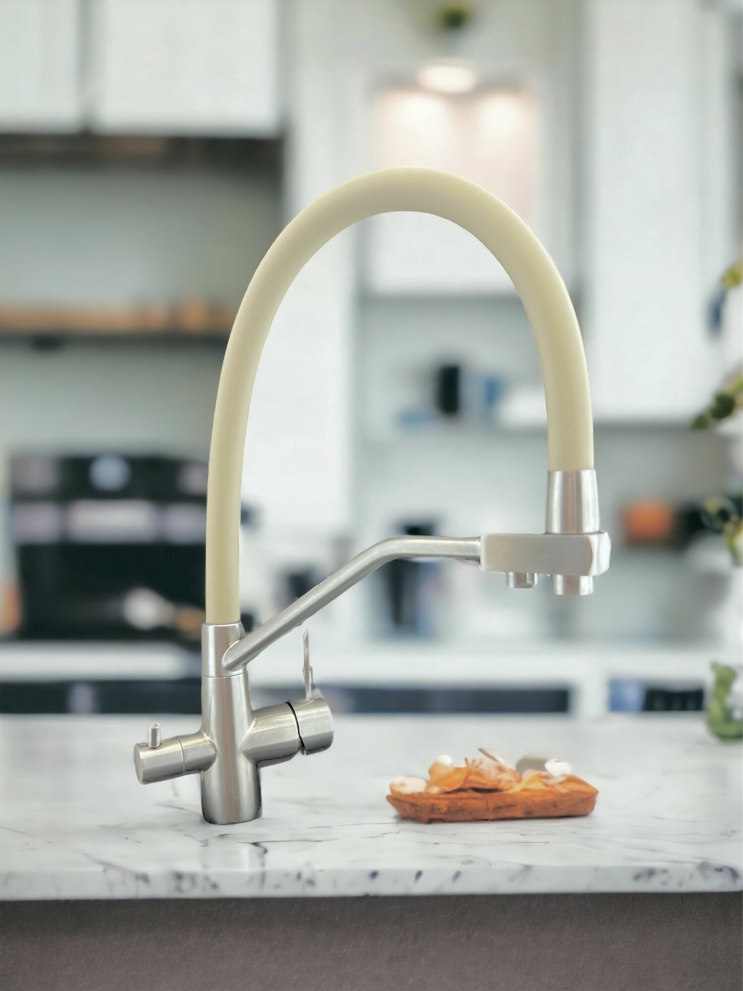 Смеситель для кухни OUTE однорычажный, с отдельным выходом под фильтр, с гибким изливом, бежевый. Латунь.