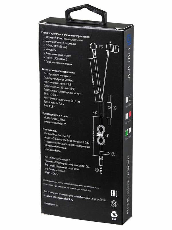 Наушники OKLICK HS-S-220, mini jack 3.5 mm, черный