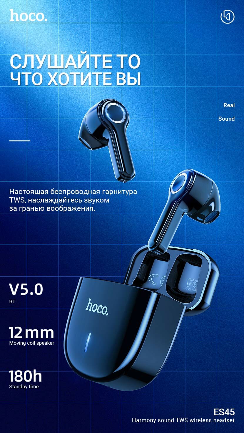 HOCO ES45 Harmony sound TWS (чёрные, Bluetooth 5.0, 2x30(320)mAh, до 3.5ч работы, USB Type-C)