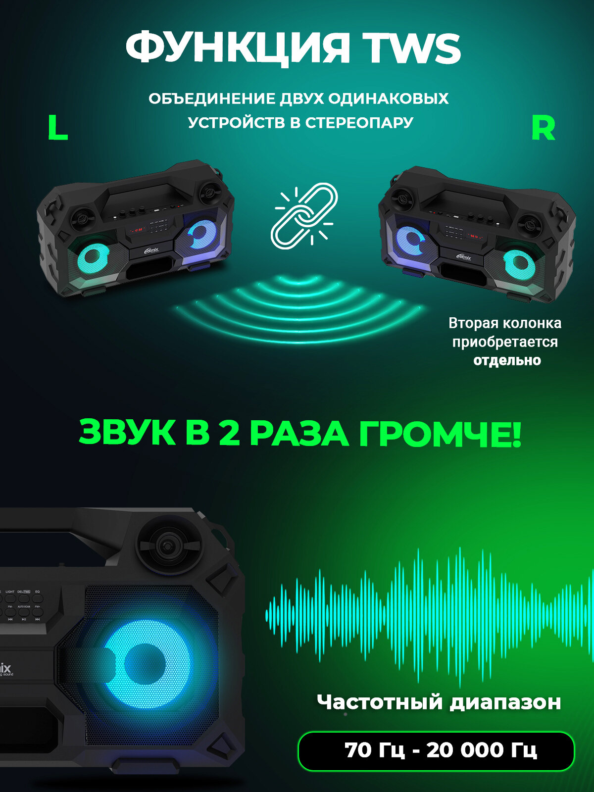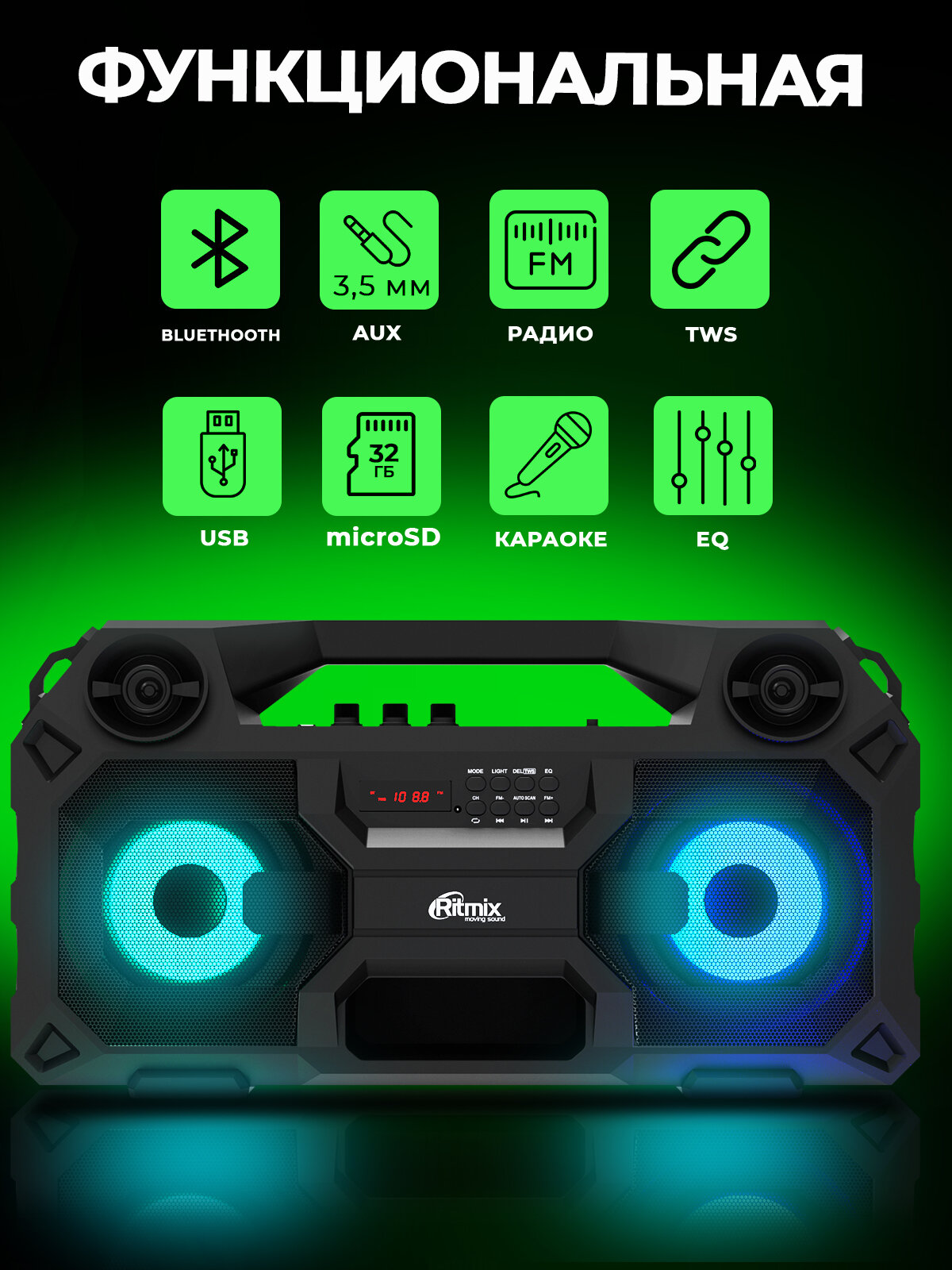 Колонка портативная RITMIX SP-690B, Bluetooth 5.0, FM-радиоприёмник, RGB подсветка, черная (1/4)