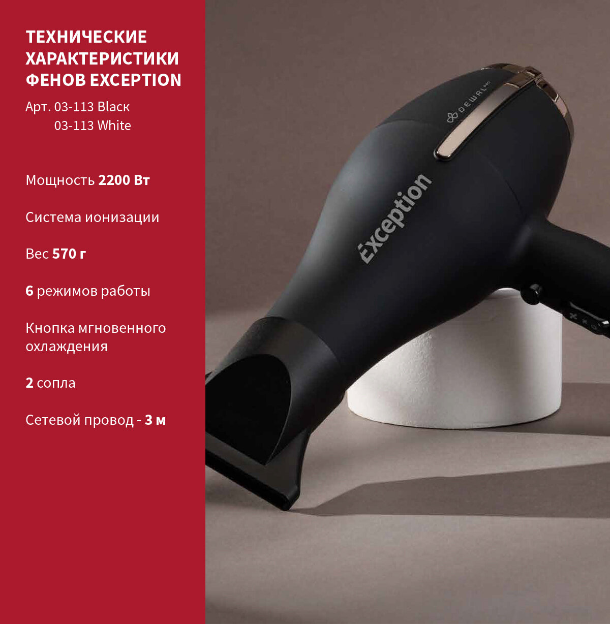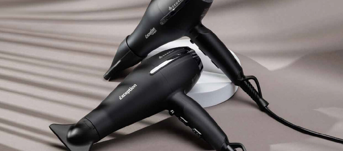 Купить Фен DEWAL EXCEPTION, черный, вес 570гр, 2200Вт, 2 насадки, провод 3м
