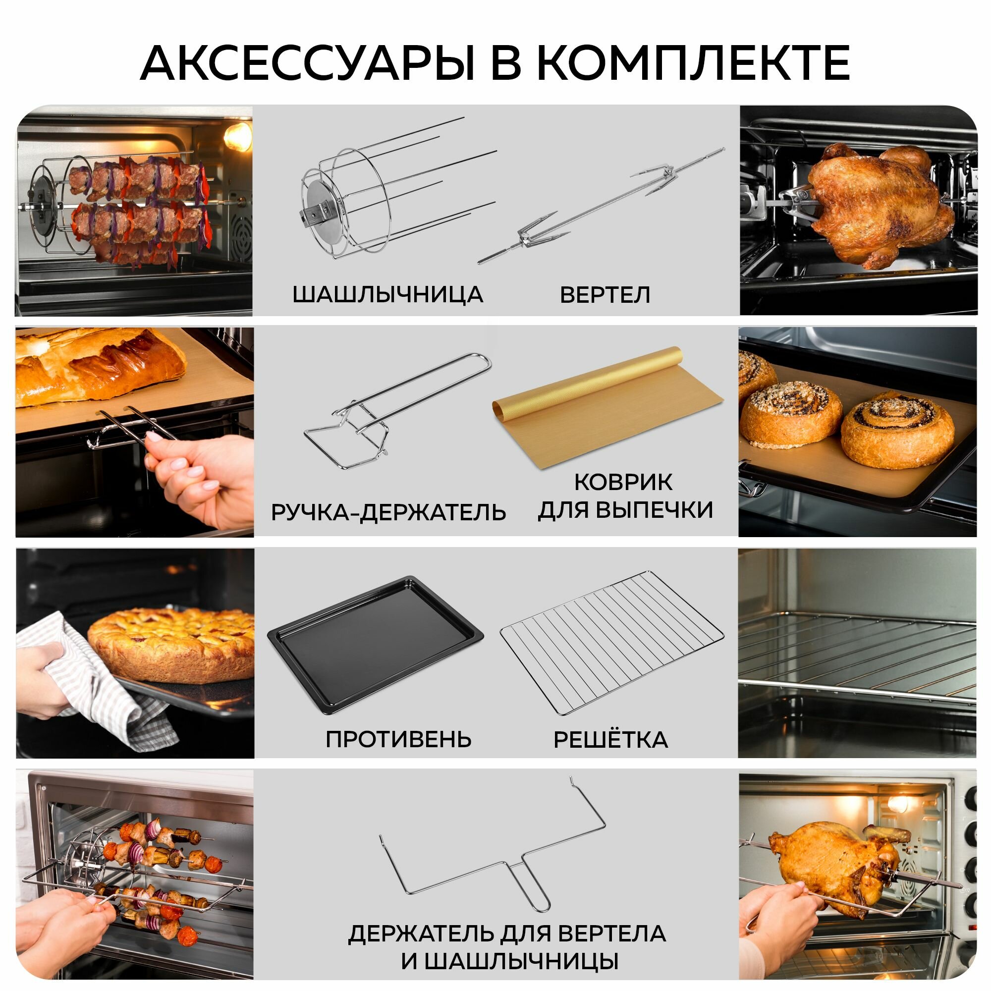Помимо протвиня и решетки есть коврик для запекания и насадки для гриля и шашлыков.