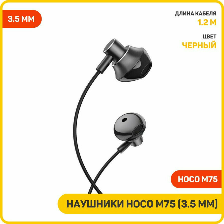Наушники Hoco M75, проводные, вкладыши, микрофон, Jack 3.5 мм, 1.2 м, черные