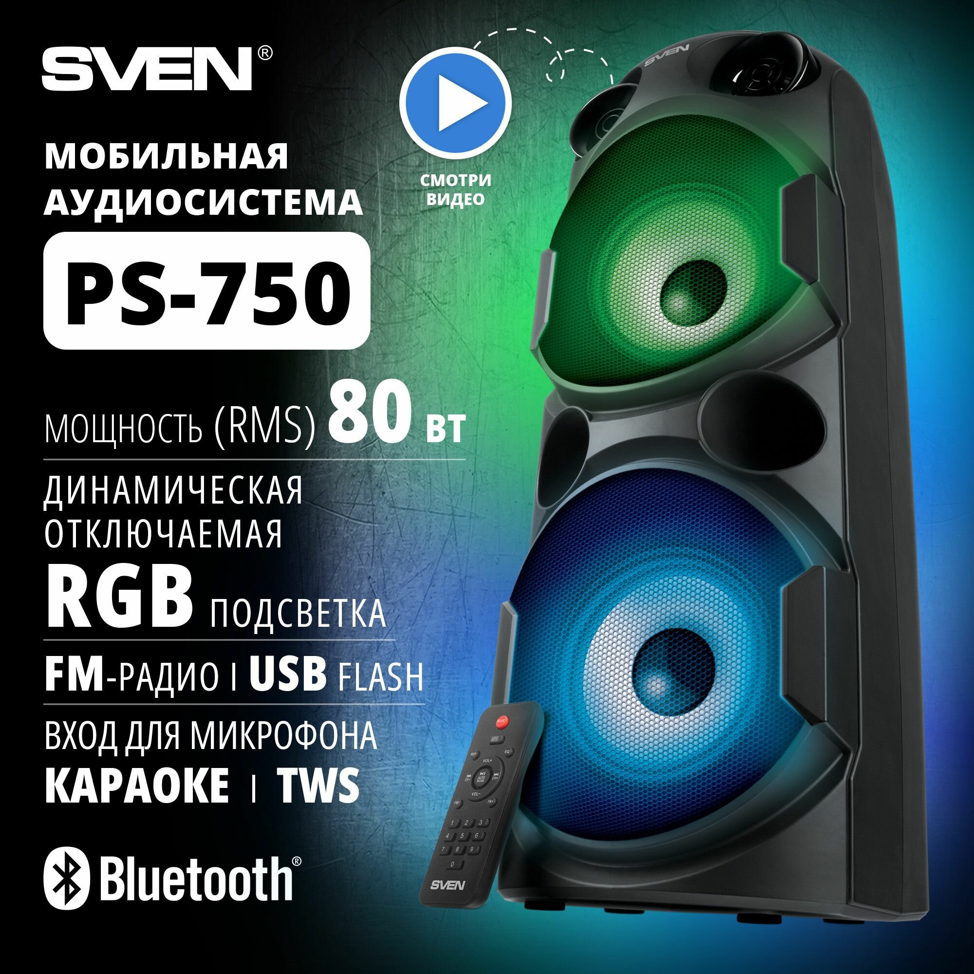 Колонка АС SVEN PS-750, черный (80 Вт, TWS, Bluetooth, FM, USB, microSD, LED-дисплей, 2х4400мА*ч)