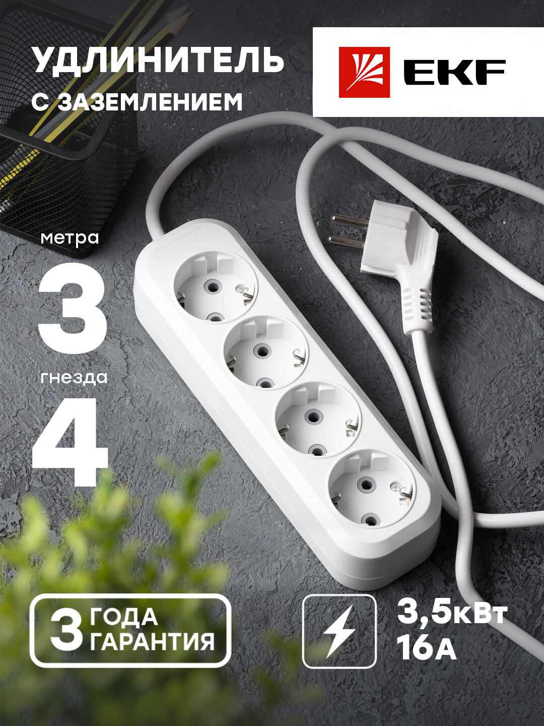Удлинитель "Эксперт" 4 гнезда 3 метра 16А/3,5кВт с заземлением ПВС 3х1 EKF