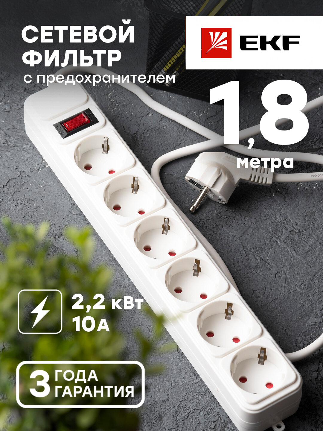 EKF UFP10-375-6-018 Сетевой фильтр 6*1,8м 10А/2,2кВт с выкл. c/з ПВС 3х0,75 Блокбастер EKF PROxima