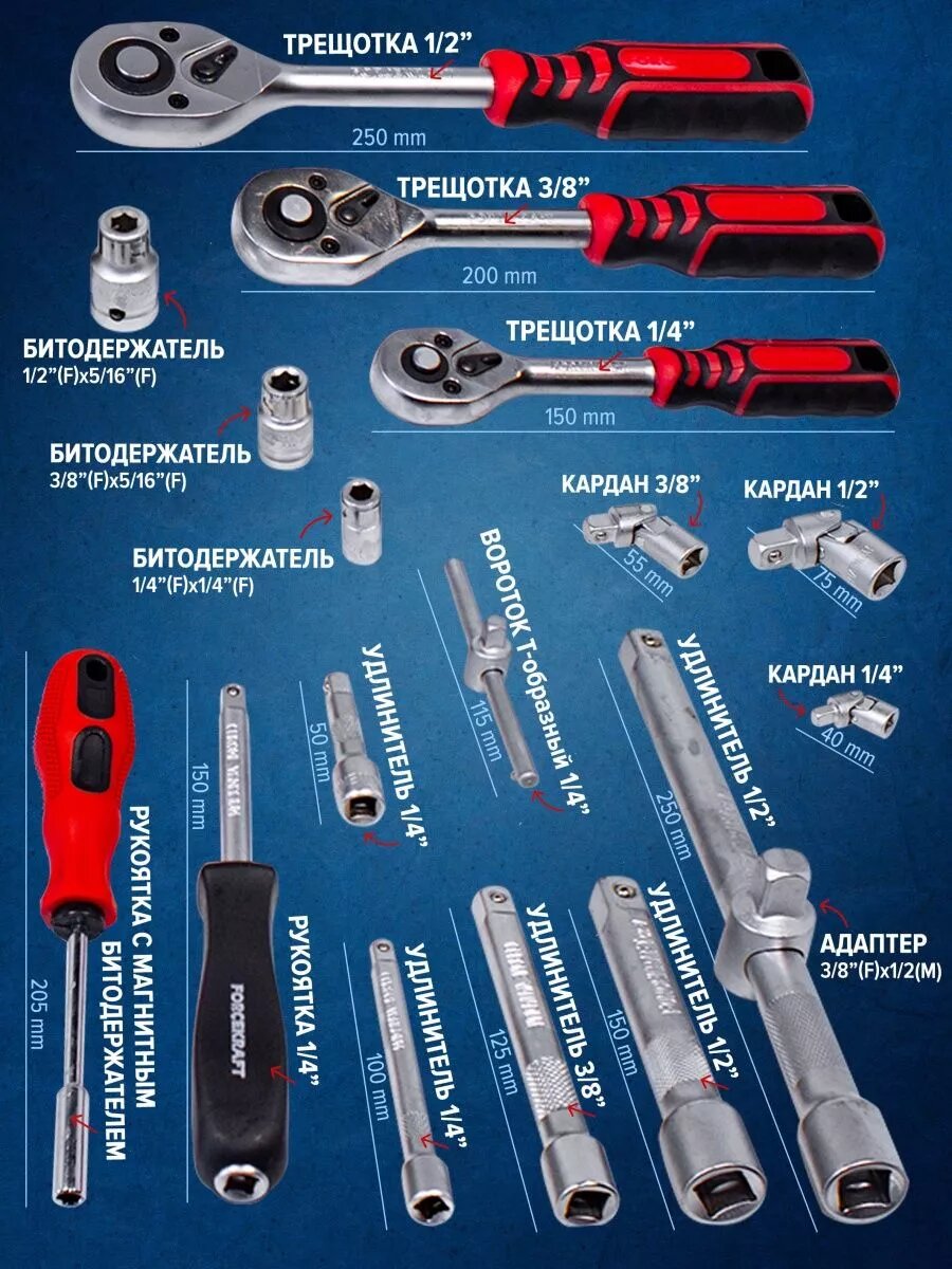 | Головки торцевые подробно | 1/2": трещотка реверсивная, т-образный вороток 250 мм, удлинитель 125 мм, шарнир карданный |
