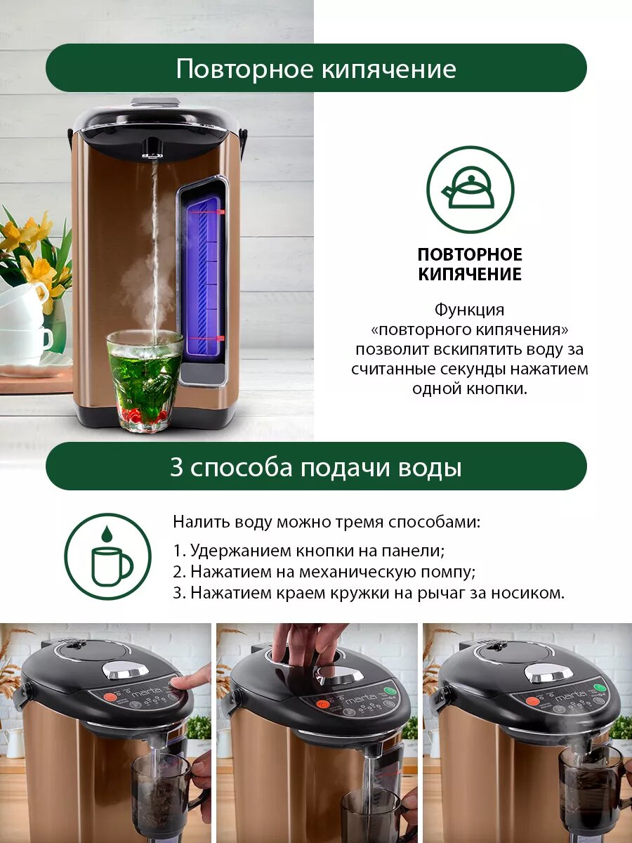 | Отзыв: | Купил такой термопот практически по цене чайника. Пользуюсь, пока доволен. Объём нормальный, 4 литра хватает более чем. Температуру держит хорошо. Стенки двойные, снаружи не нагревается. Помпа нормально работает. Без воды не включишь, срабатывает блокировка.