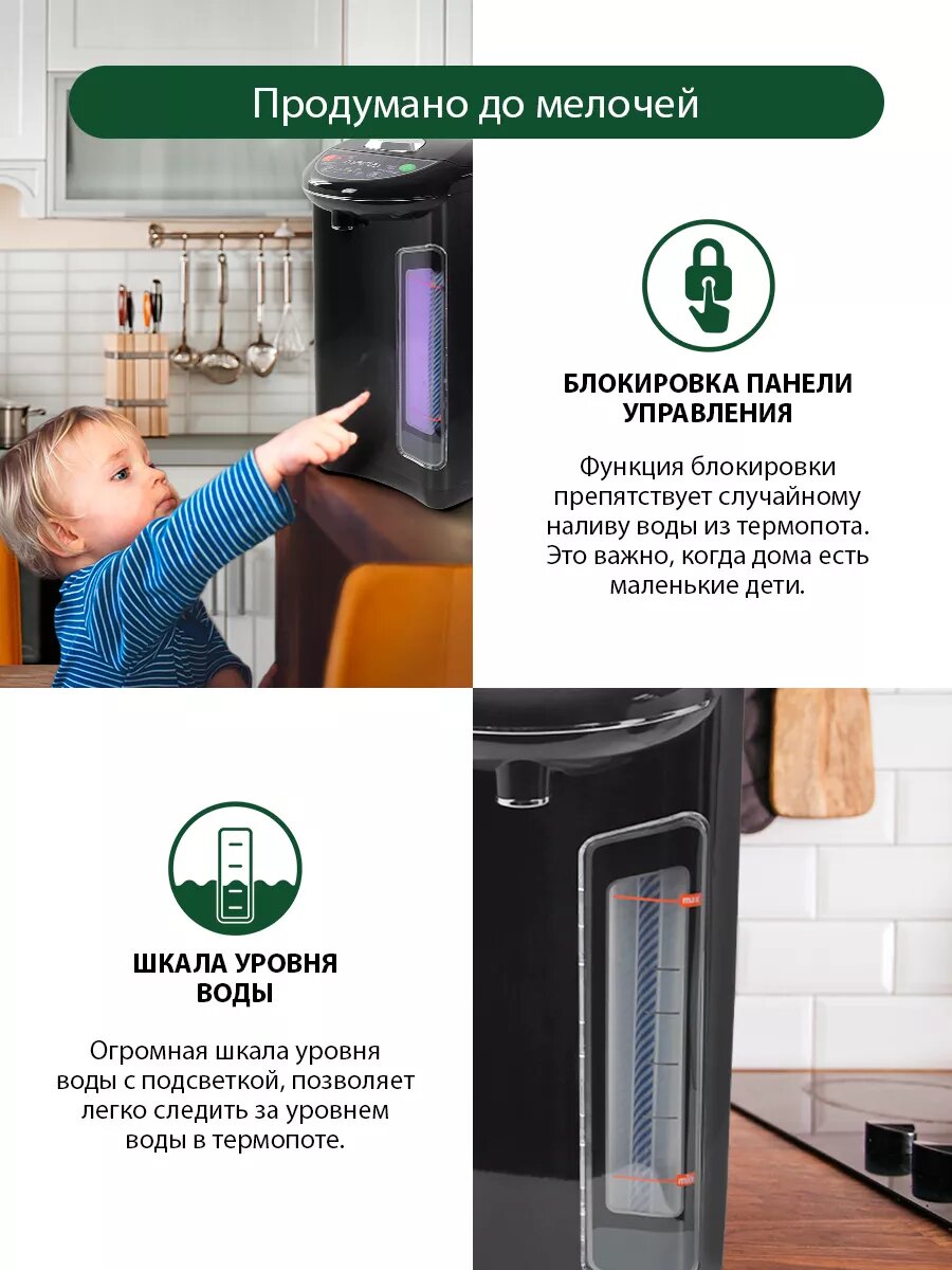 Что хочу отметить в первую очередь -- это очень безопасное устройство! Что особенно важно, если в доме маленькие дети. Крышку термопота открыть непросто и для взрослого, кнопка ручного насоса с блокиратором, кнопка подачи воды блокируется автоматически -- чтобы налить воду, сначала надо снять блокировку. За это отдельная пятёрка! Так что если в семье маленькие, но пронырливые детки -- берите, надёжная вещь. По шкале прекрасно видно сколько воды осталось, плюс яркая подсветка. Единственное, наружная шкала не всегда точно показывает уровень наливаемой воды до закипания и вода может начать брызгать через отверстие для пара. По внутренней отметке ориентироваться НЕЛЬЗЯ, только по внешней! Мне это неудобно. Крышка легко снимается и за это ещё одна отдельная пятёрка! Если нужно помыть, труда это не составит. Некоторые ругают за то, что долго ждать закипания, если вода и сам термопот холодные. Для меня совершенно некритично, потому что у нас его включает тот, кто встал первым, и пока умылись-переоделись, кипяток уже готов. Его много - 3 литра, так что точно хватит всем (у нас 6-8 человек обычно). Кстати, время закипания не такое уж большое, всего 20 минут. А потом можно выставить ту температуру, которую вы хотите чтобы он поддерживал -- от 45 до 98. И это ещё один огромный плюс! Бывает, что электронасос сразу после закипания не очень справляется со своей задачей, но для меня это вообще не проблема, я пользуюсь ручным обычно. Очень надеюсь, что прослужит не меньше первого. Спасибо! |