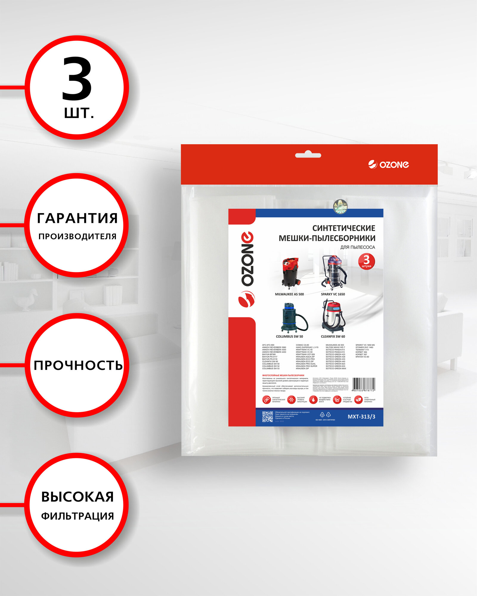 OZONE Мешки-пылесборники синтетические для пылесоса, 3 шт MXT-313/3
