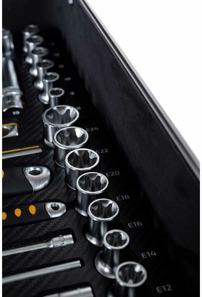 | Дополнительная информация | комплектация: 1/4" торцевые головки; 1/2" торцевые головки ; 1/4" удлиненные головки. ; 1/4" удлиненные головки; 1/4" головки Е-типа; 1/2" головки Е-типа; 1/2" свечная головка с магнитом; 1/4" удлинители для головок; 1/2" удлинители для головок;; 1/4" гибкий удлинитель – 150 мм. ; 1/4" и 1/2" карданные шарниры; 1/4" Т-образный вороток – 115 мм; 1/2" Т-образный вороток – 300 мм.; 1/2" шарнирный вороток – 375 мм. ; 1/4" трещоточный ключ; 1/2" трещоточный ключ;; набор имбусовых шестигранных ключей; набор шестигранных ключей типа Torx; комбинированные ключи; разрезные ключи; отвертки; комбинированные пассатижи; переставные клещи; молоток; набор выколоток, кернов и зубил – 5 шт. ; телескопическая рукоятка с магнитным держателем.; кейс |