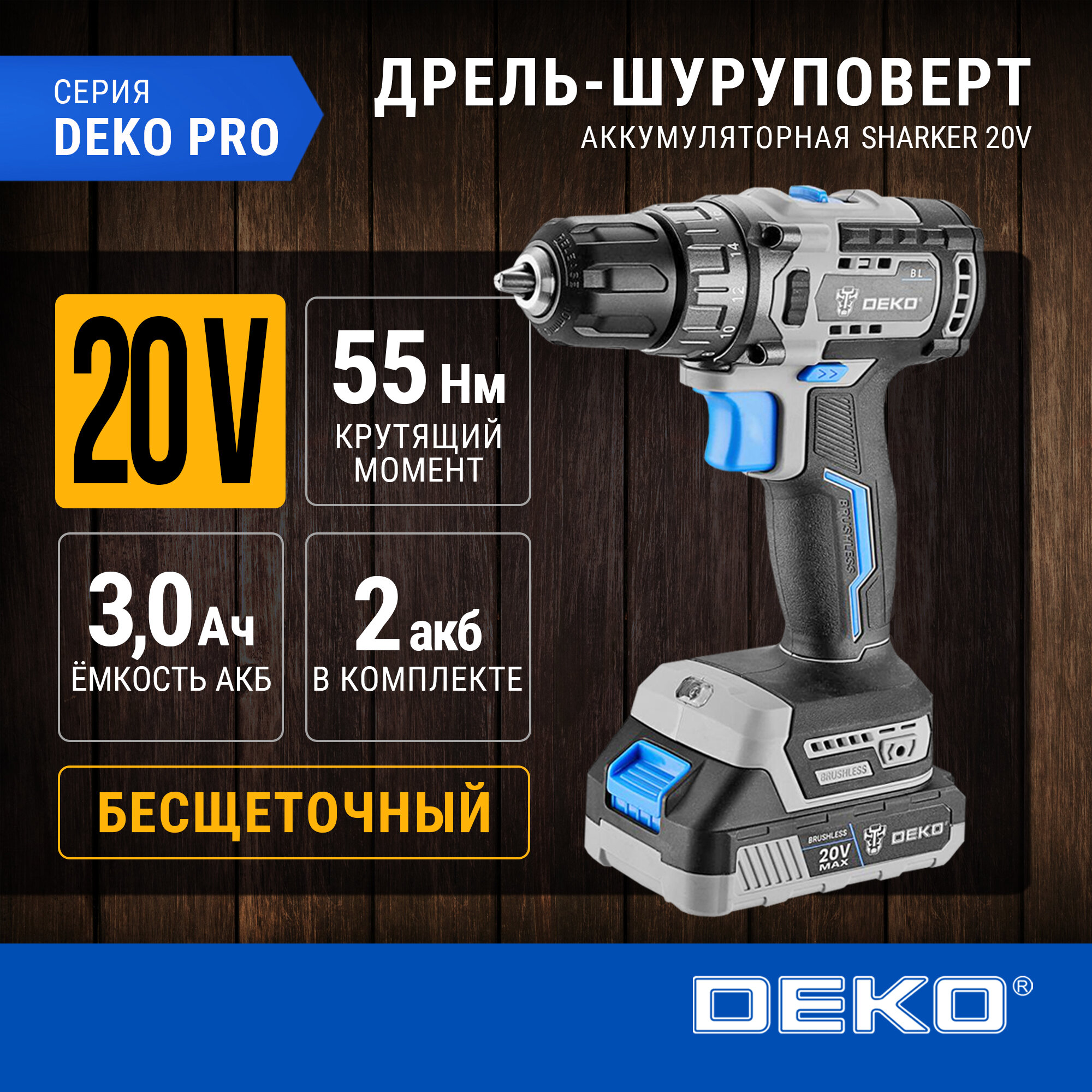 СохранитьДрель-шуруповерт аккумуляторная бесщеточная DEKO Sharker 20V в кейсе, 20В, 2*3.0Ач интересное: