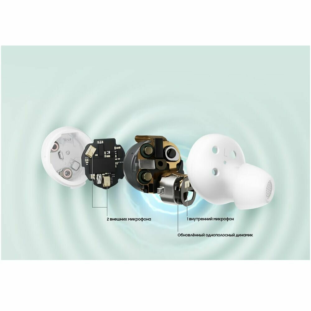 | Дополнительная информация | двухполосные динамики (11 мм вуфер, 6.5 мм твитер), объёмное звучание 360 Audio; поиск наушников через SmartThings; автопереключение между устройствами, быстрое подключение к ПК (функция SwiftPair); зарядка: кабель (USB Type-C), беспроводная (стандарт Qi), от смартфона Galaxy (DPD, PowerShare); время воспроизведения: 5ч/8ч (с включенным/выключенным ANC), вес футляра - 45 г. |