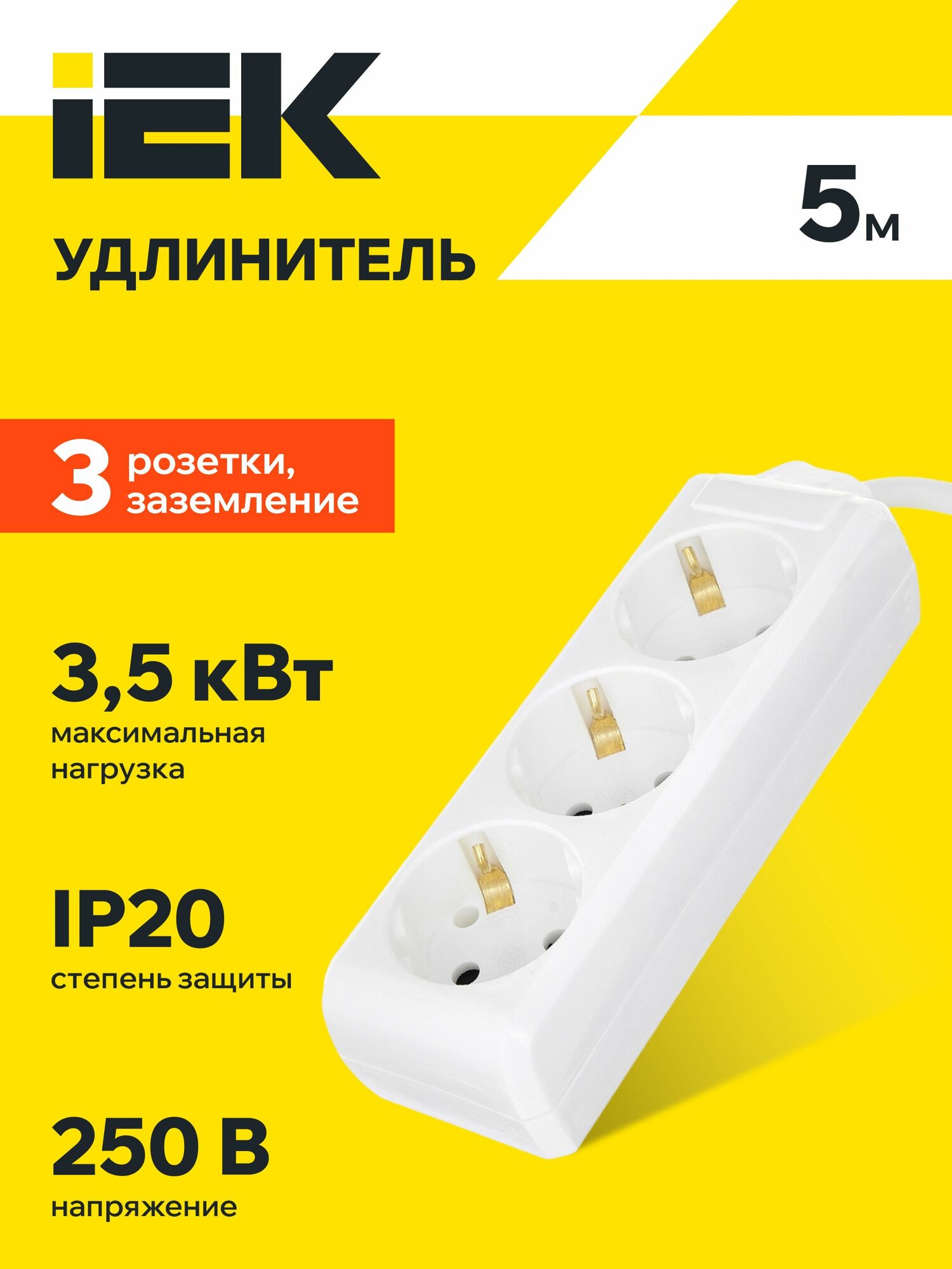 Удлинитель IEK WYP10-16-03-05-Z-N, 3 розетки, 5 м, с/з, 16А / 3500 Вт белый
