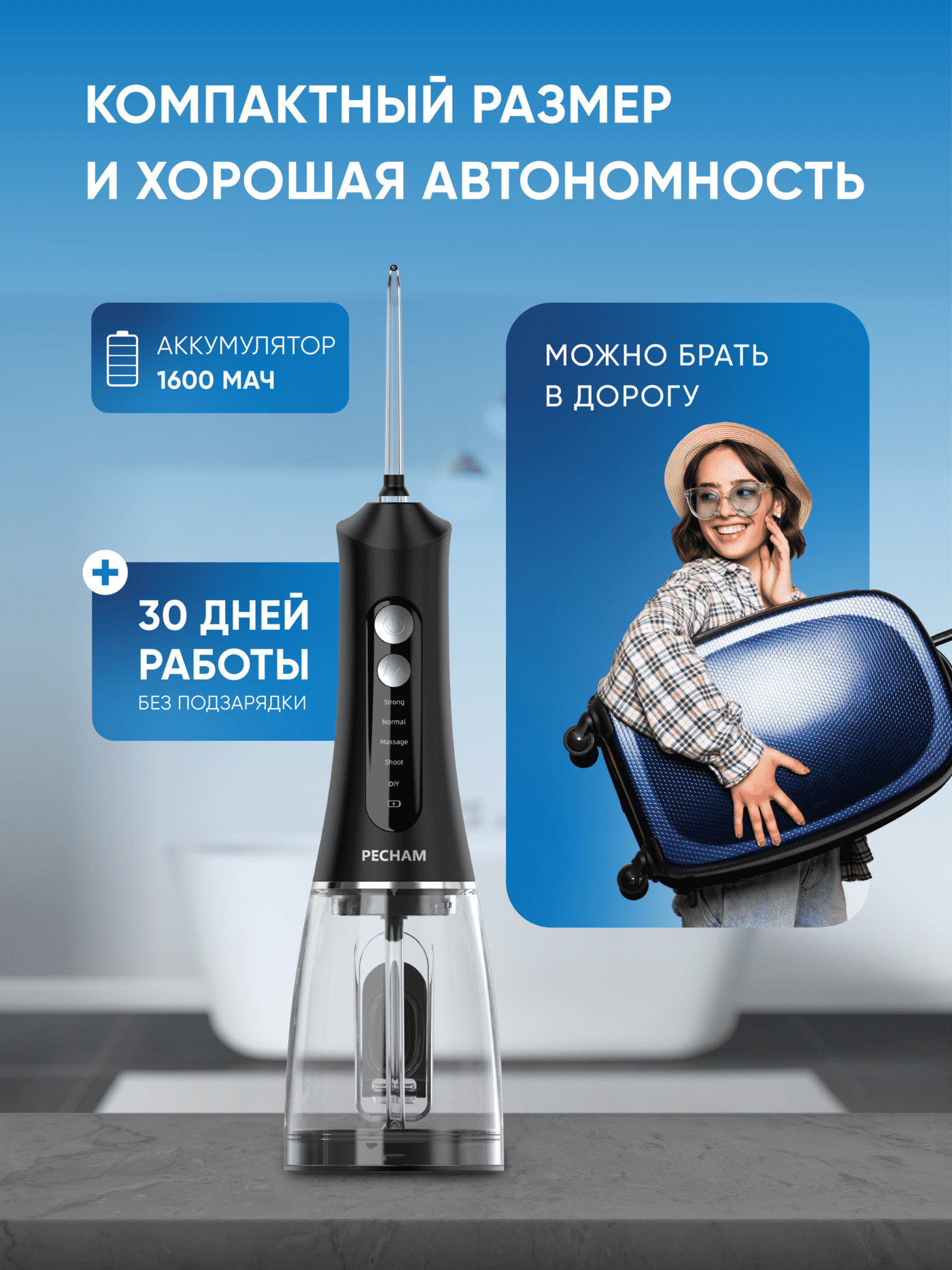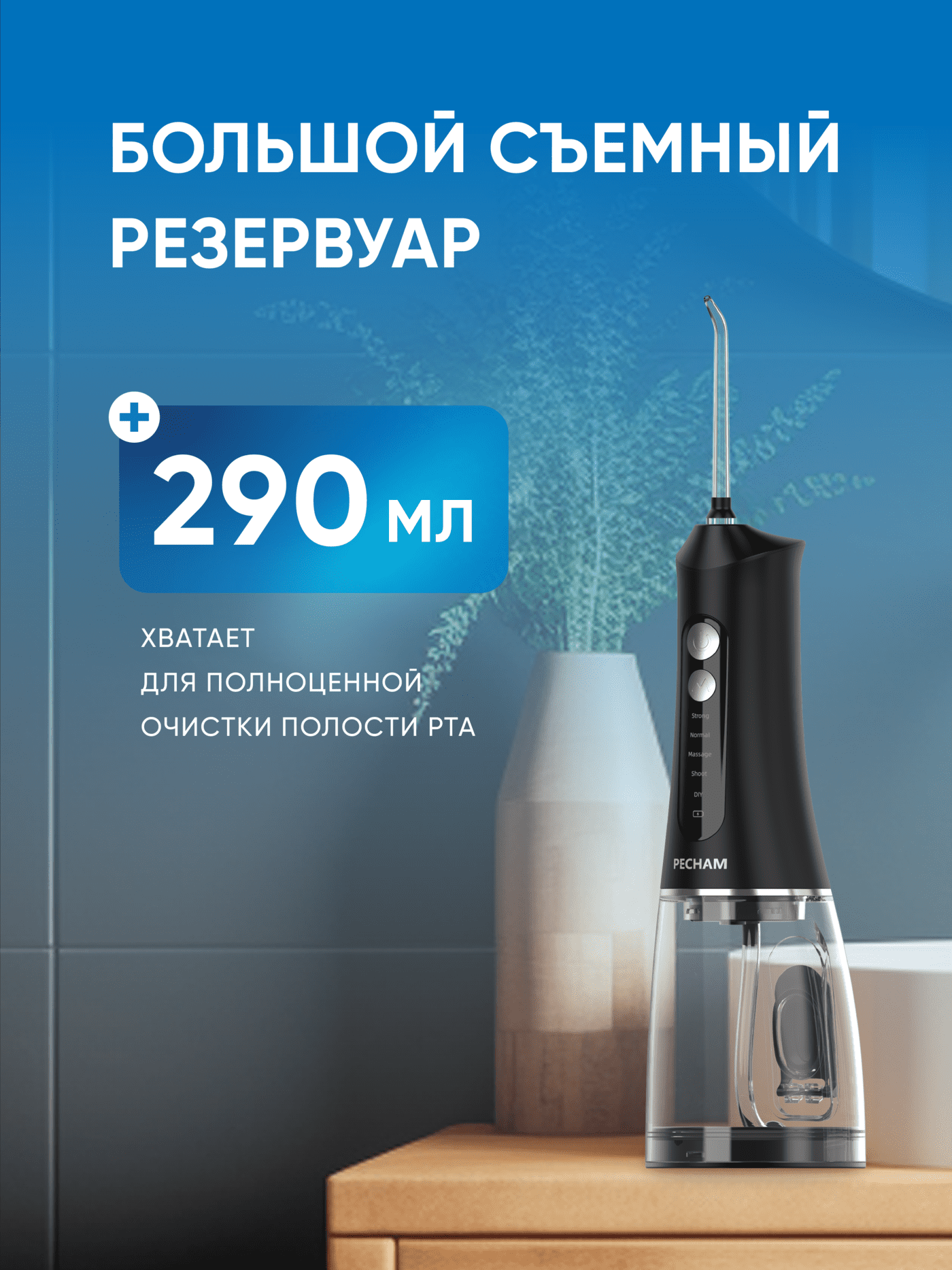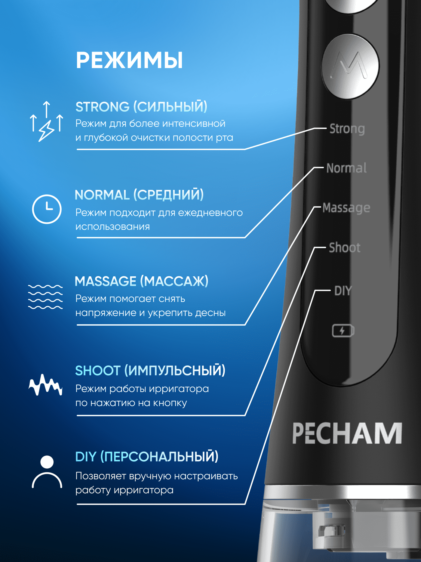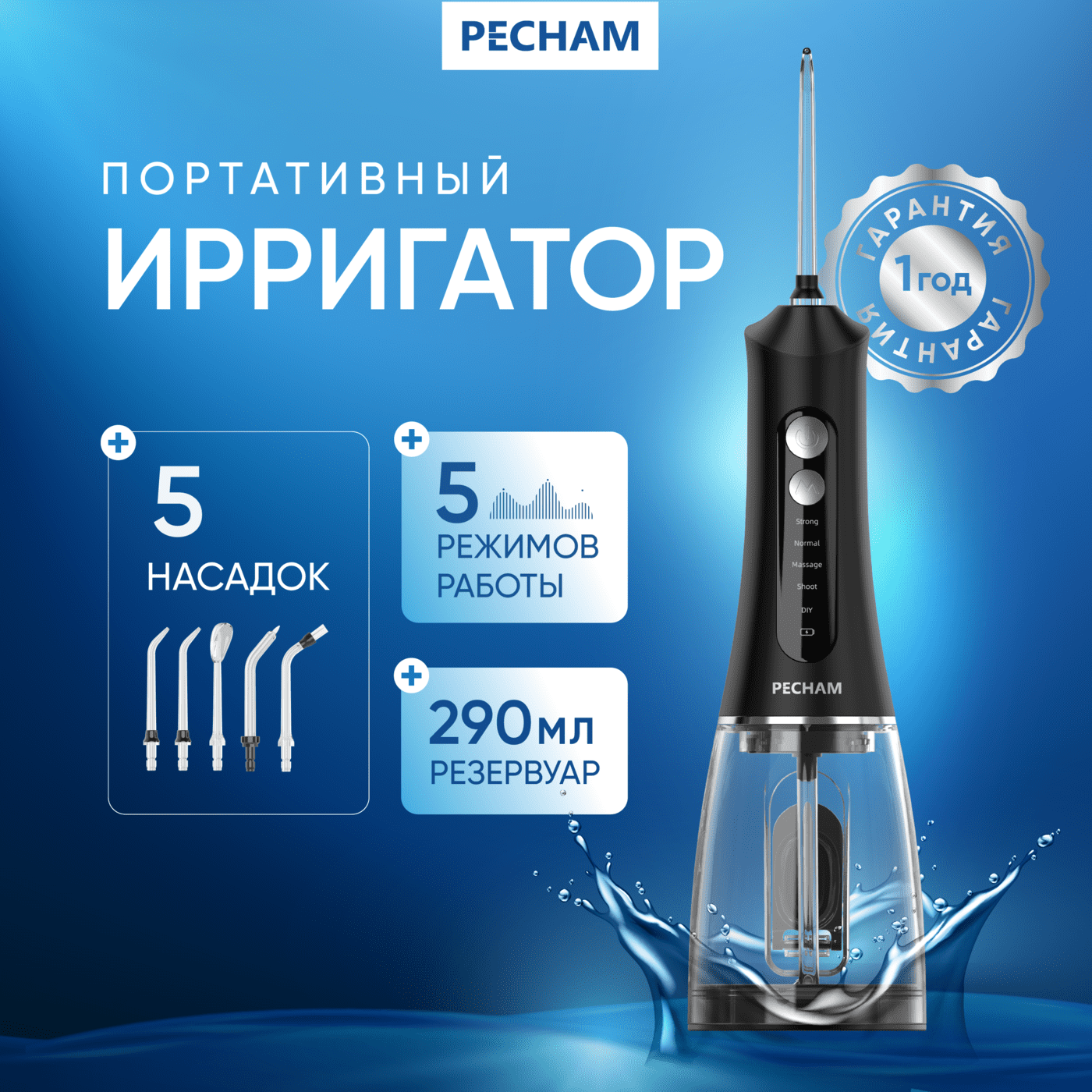 Ирригатор для полости рта PECHAM Trip Black, Портативный, 5 насадок, Емкость 200 мл.