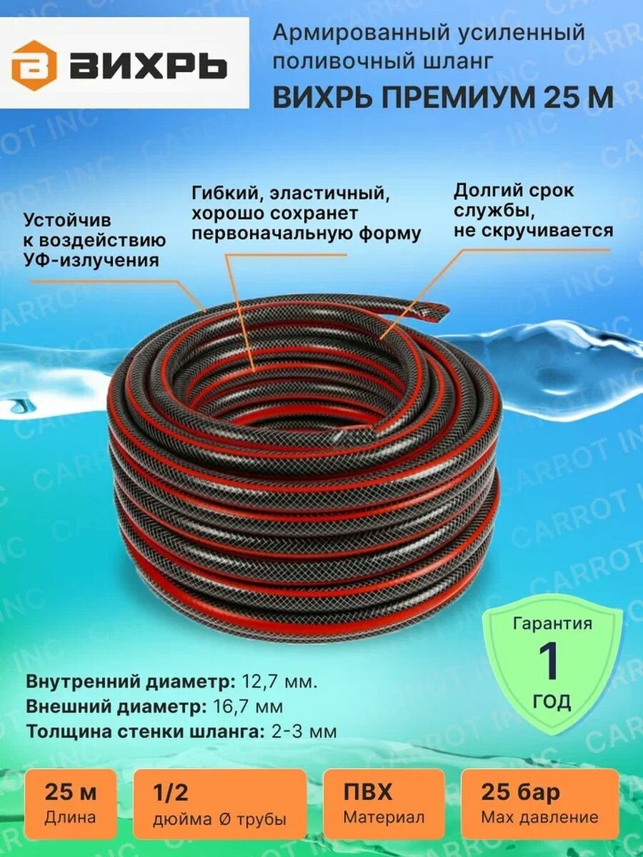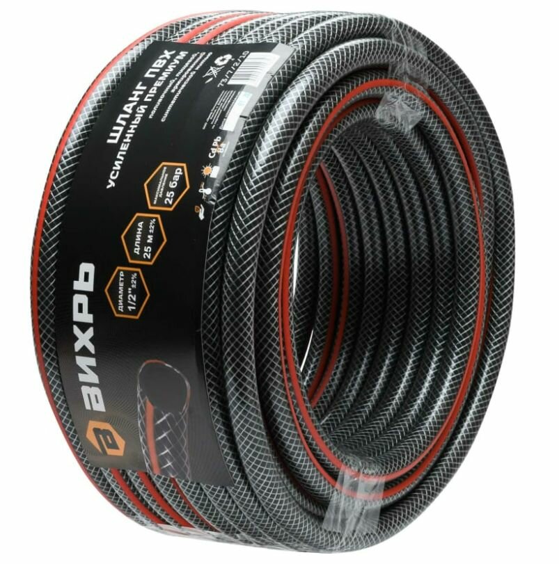 Шланг поливочный Вихрь ПВХ усиленный премиум армированный 1/2, 25м