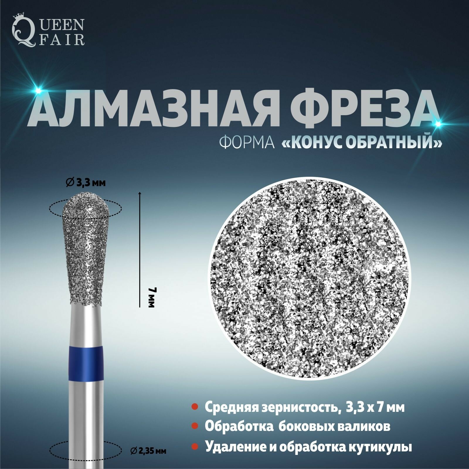 Queen fair Фреза алмазная для маникюра "Обратный конус", средняя зернистость, 3,3 × 7 мм