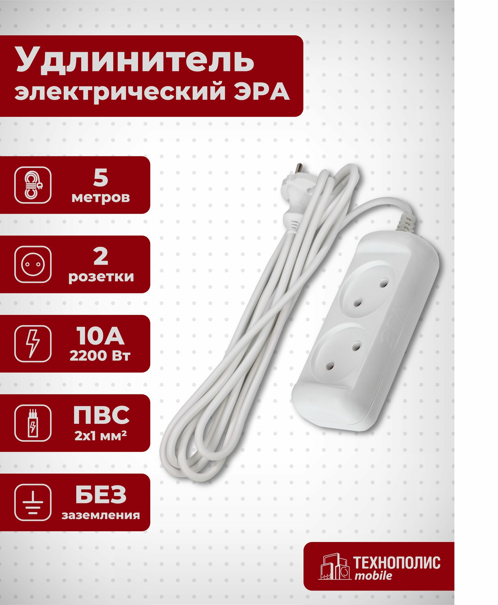 Удлинитель без зазeмл., 2х1мм2, 10А, ПВС, 2гн, 5м (10840) U-2-5m-2x1, ЭРА Б0028361 (1 шт.)