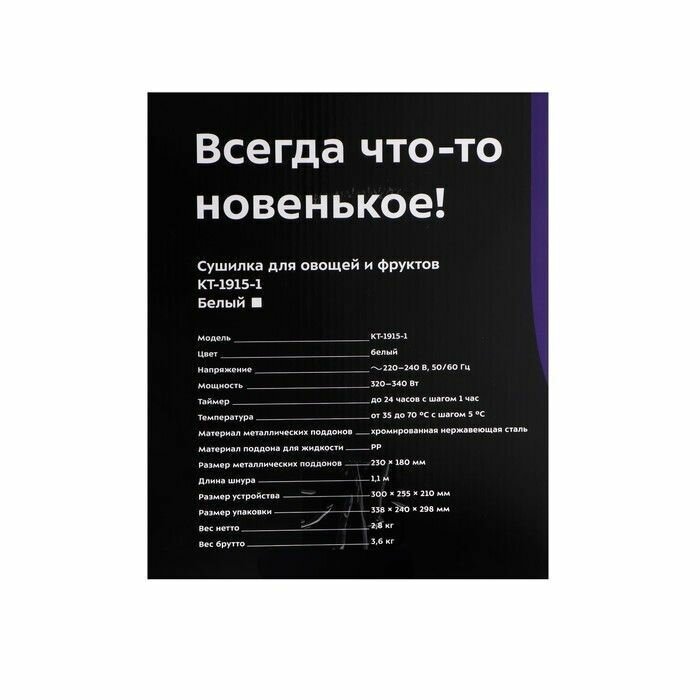 Сушилка для овощей и фруктов КТ-1915-1, 340 Вт, 4 яруса, 230х180 мм, белая