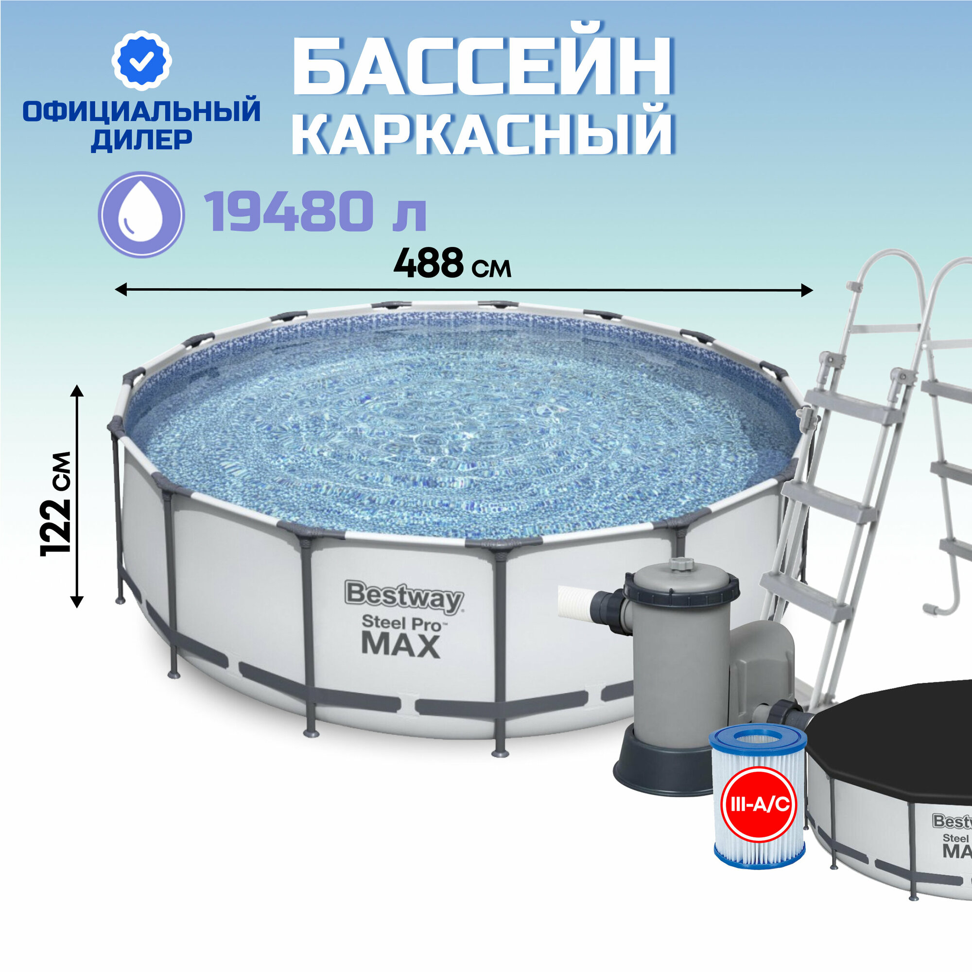 Бассейн каркасный круглый с фильтр-насосом Bestway 5612Z Steel Pro Max 488x122 см 19480л / Бассейн бествей семейный для дачи с жестким бортом