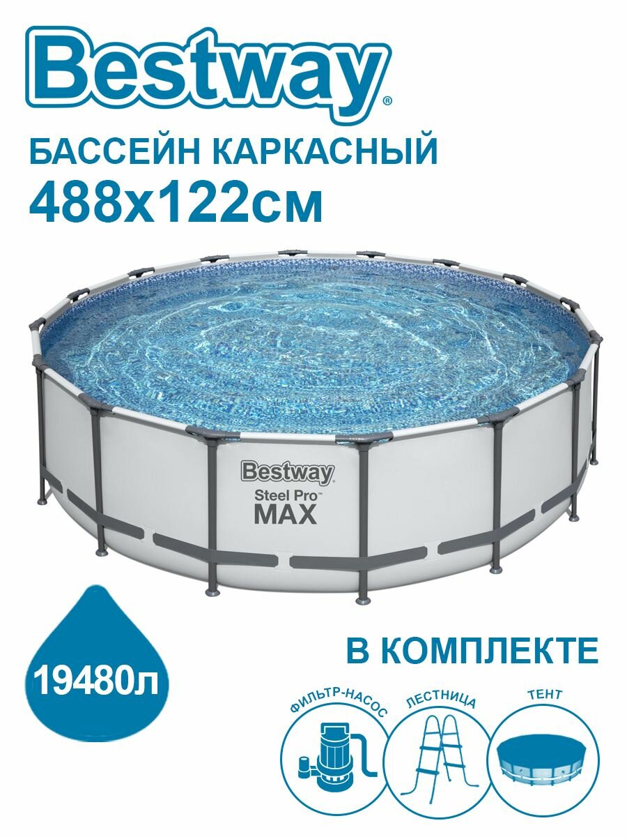 Бассейн каркасный Bestway, 488х122 см, Steel Pro Max, 5612Z, фильтр-насос, лестница, тент, 19480 л