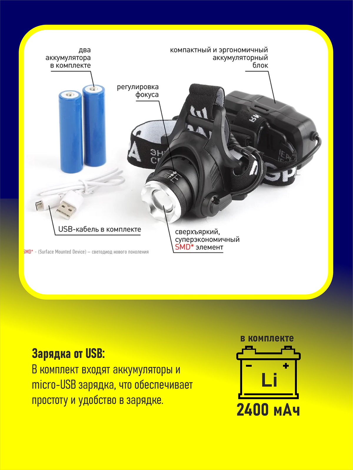 Фонарь аккумуляторный налобный GA-805 CREE 5Вт регулир. фокус литиевый аккум. 2.5А.ч алюм. USB пластик. (кор.) Эра Б0039625