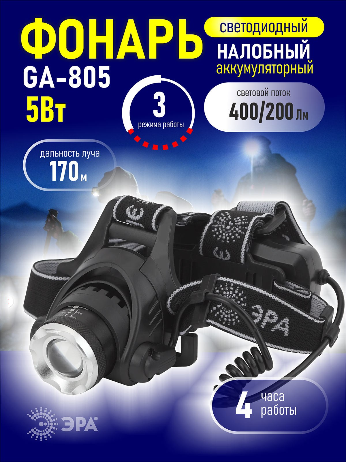 ЭРА Б0039625 Налобный фонарь GA-805 аккумуляторный, рег фокус, [5 Вт Cree, алюминий, литий 2,5Ач, US .