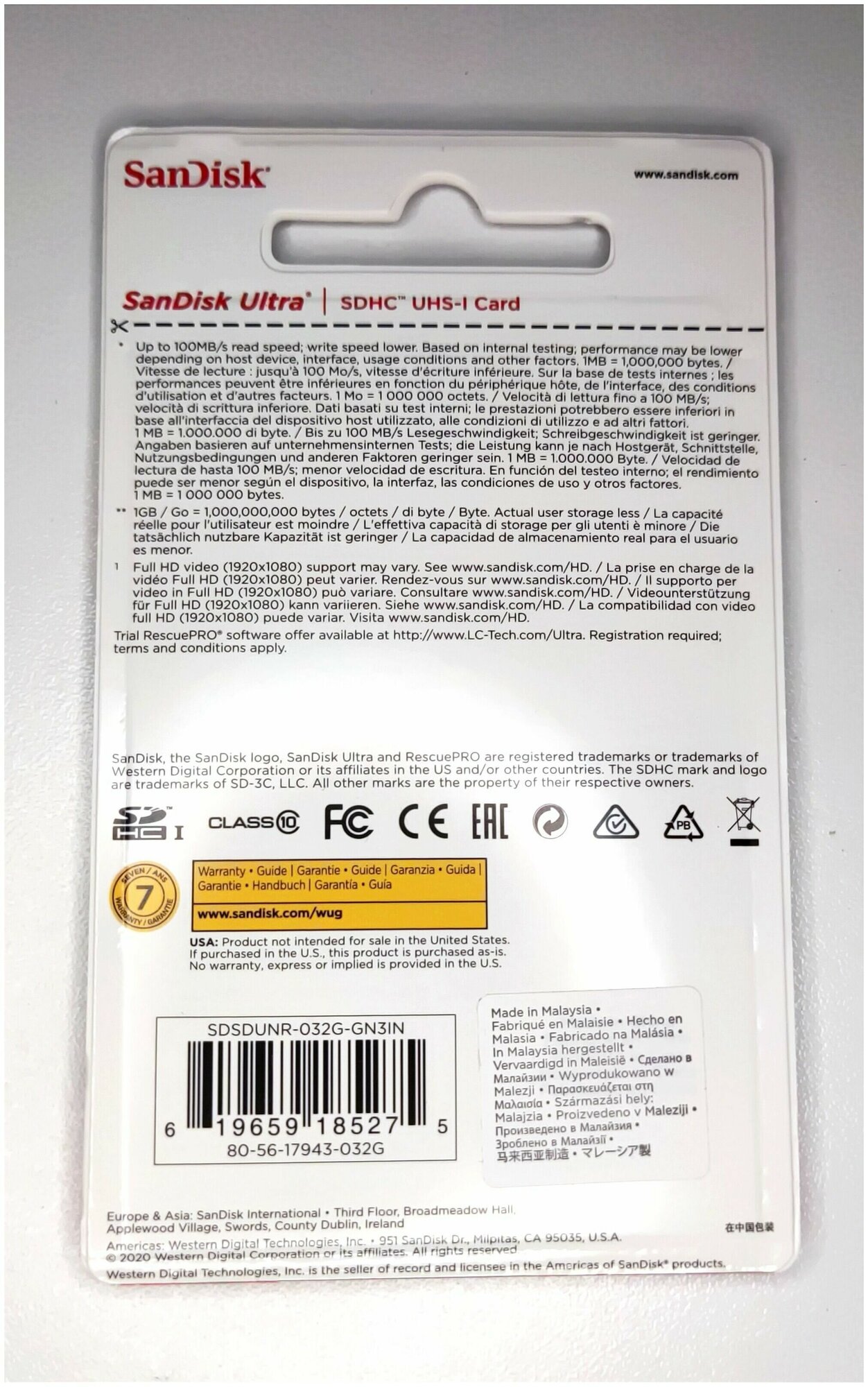 Карта памяти SanDisk SDHC 32 ГБ Class 10, UHS-I, R 100 МБ/с, 1 шт.