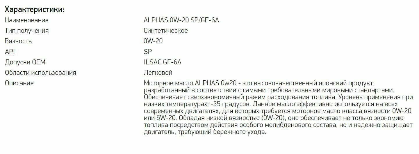 Масло моторное SP-ALPHA 0W20 SP 4L ALPHAS Арт. 809444