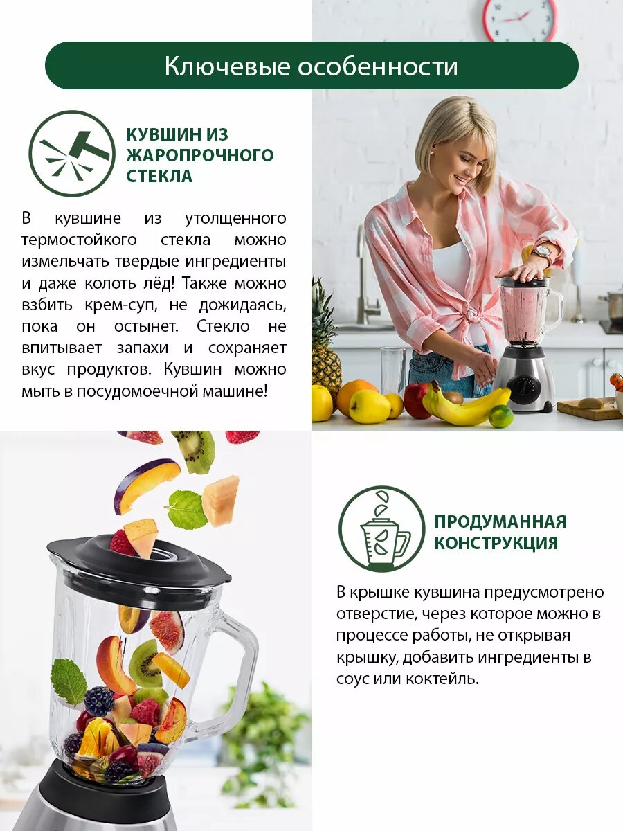 | Плюсы: | Дизайн, 5 скоростей работы, большая стеклянная ёмкость |