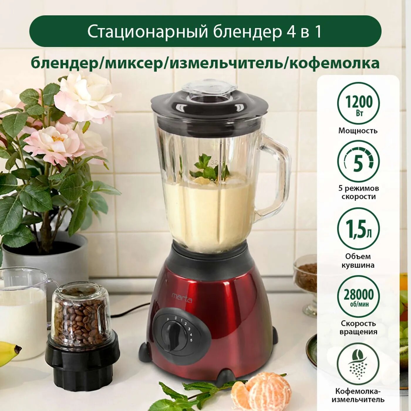 Купить Блендер MARTA MT-1591 стационарный стекло с насадкой измельчителем 1200Вт, красный/черный
