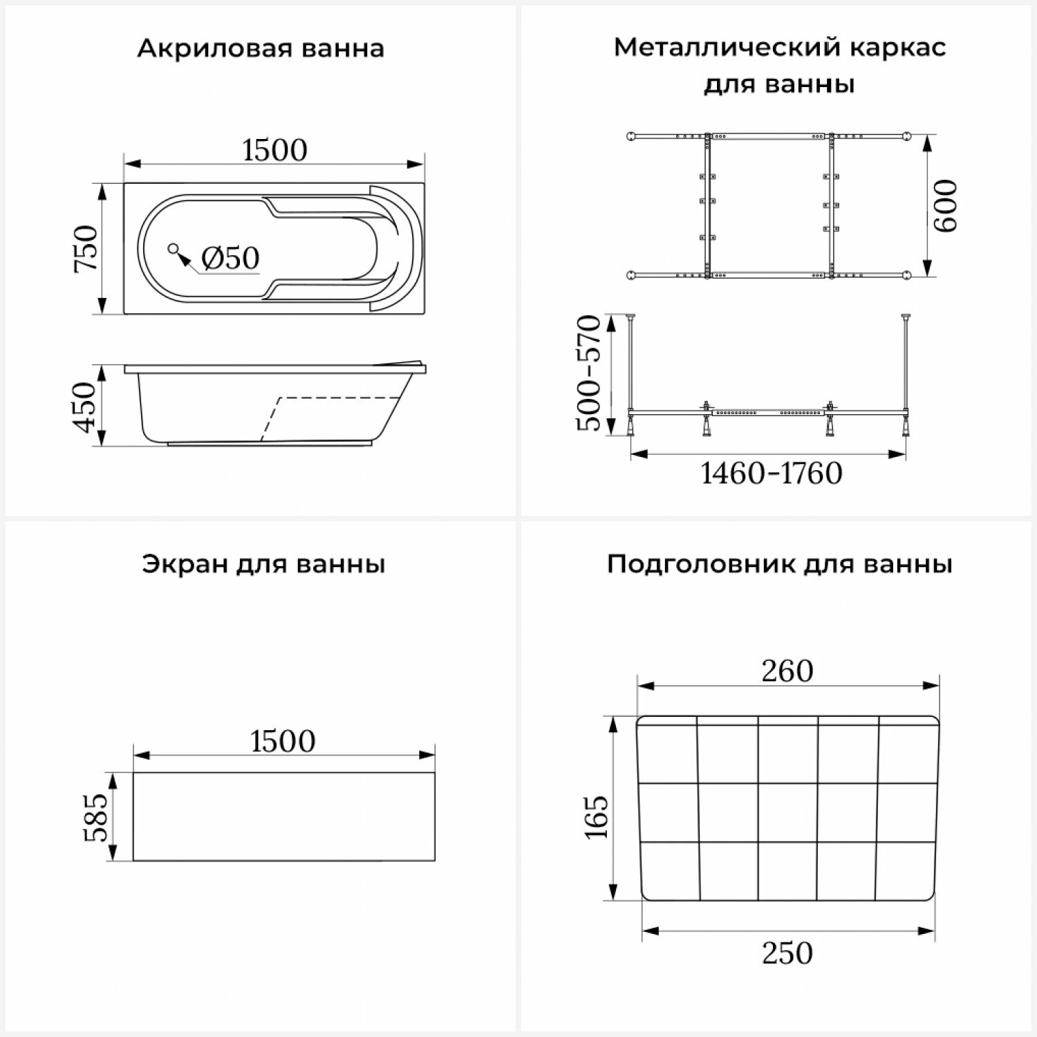 Акриловая ванна 150х75 см Lavinia Boho Bristol набор 4 в 1 S2-3502005P: прямоугольная ванна, металлический каркас, подголовник, лицевой экран